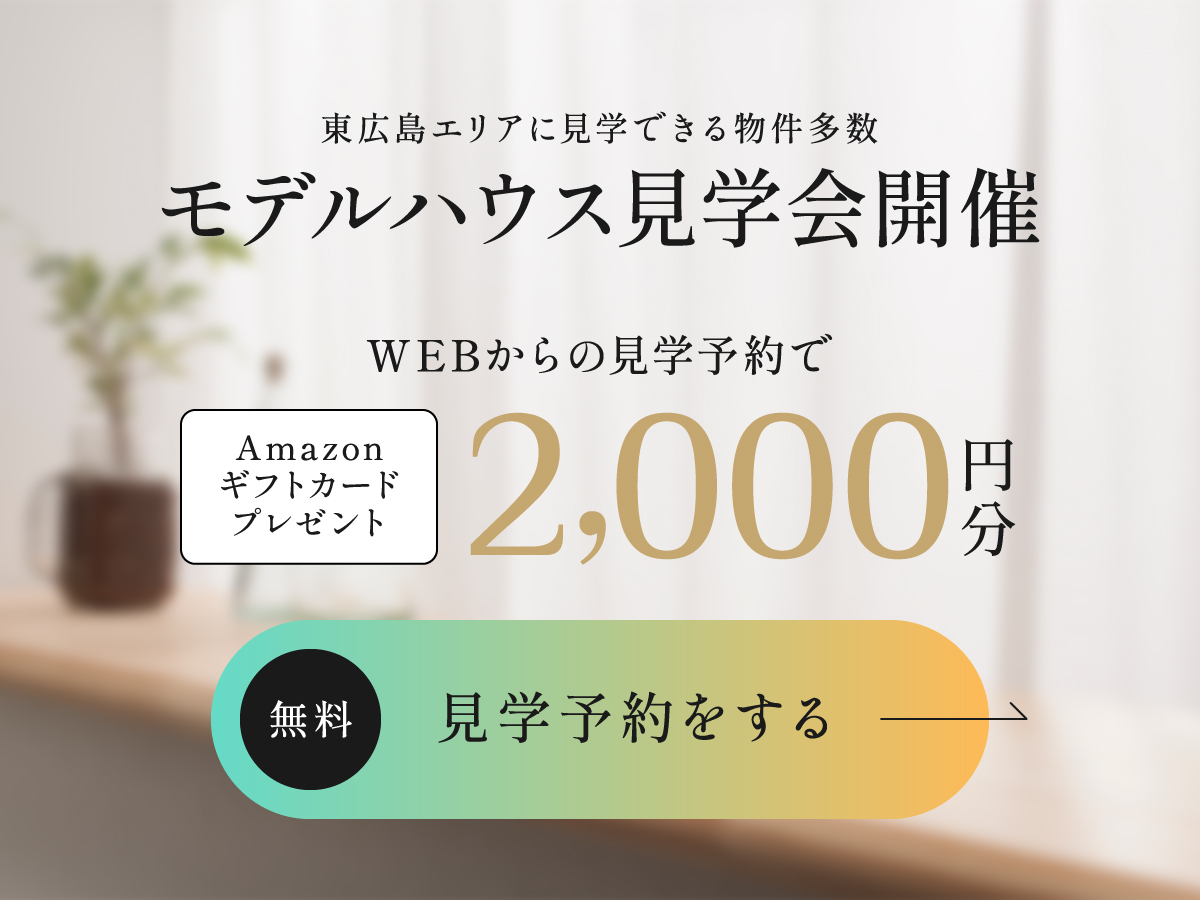 【見学予約でAmazonギフトカード2000円分プレゼントについて】※同居のご家族1組につき、1回限りとさせていただきます。※複数物件へご来場いただいた場合でも、ご来場プレゼントは1回限りの進呈とさせていただきます。※お電話やポータルサイト等、公式サイトの予約フォーム以外からのご予約は対象外となります。※本特典はワウハウスによる提供です。本特典についてのお問い合わせはAmazonではお受けしておりません。※Amazon、Amazon.co.jpおよびそれらのロゴはAmazon.com,Inc.またはその関連会社の商標です。