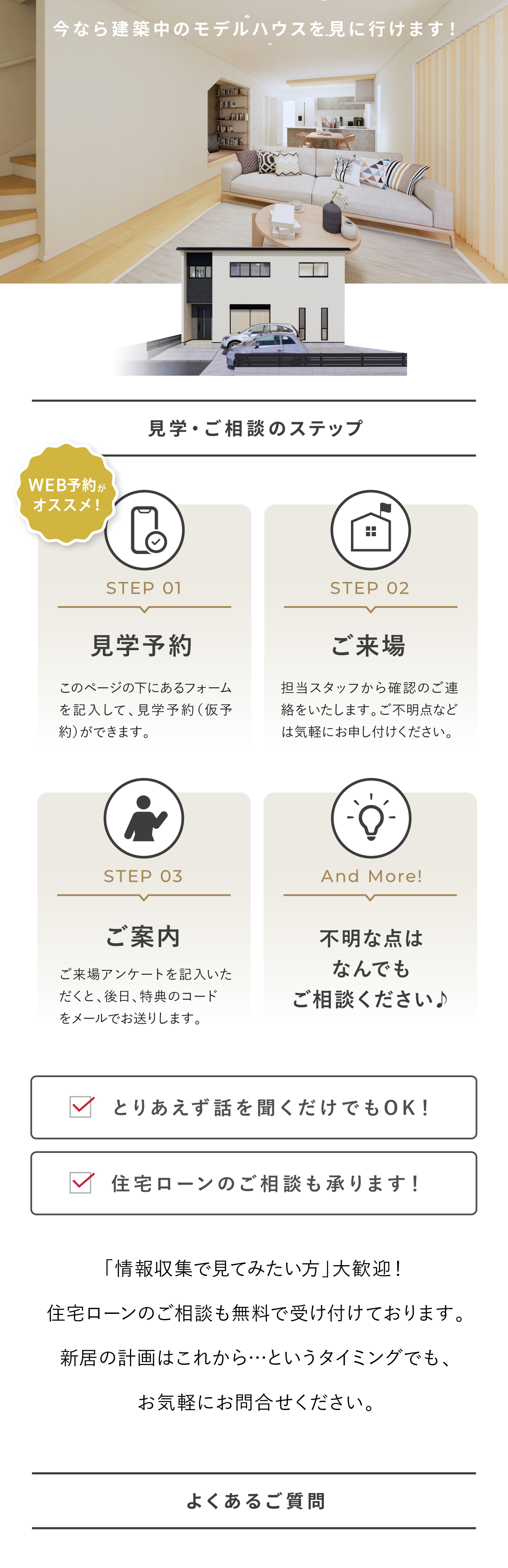- A. はい、可能です。住宅ローンに関するご相談も承っておりますので、お気軽にご質問ください。提携金融機関のご紹介や、資金計画についてもご説明させていただきます。