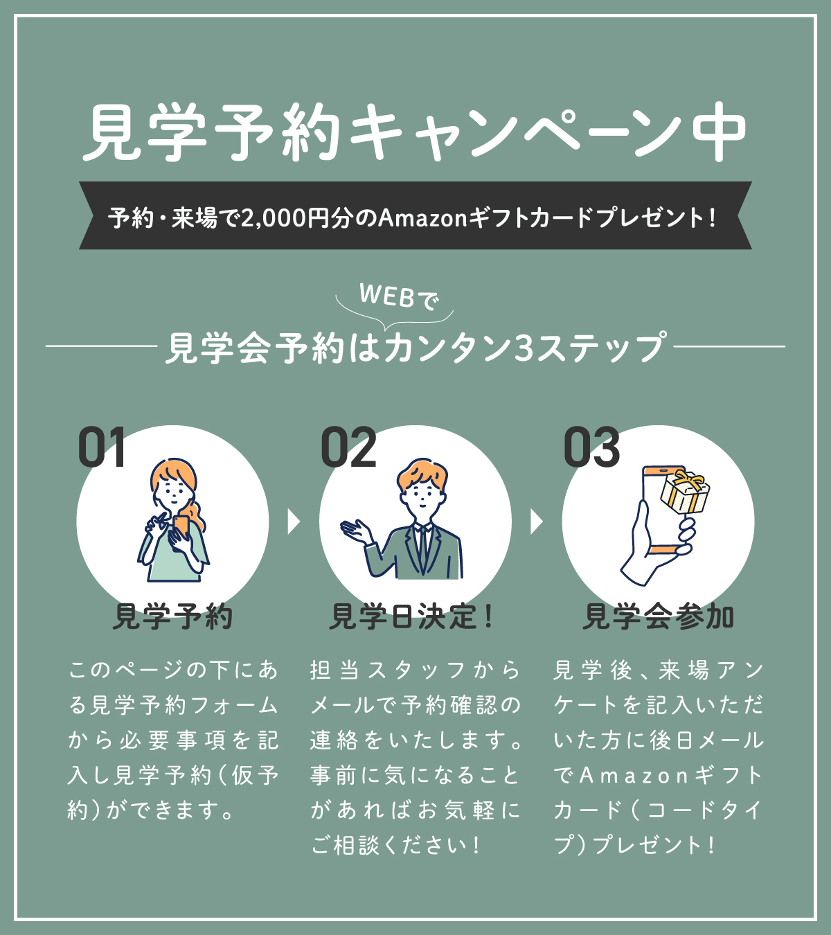 - A. 見学は【事前予約制】となっております。現地には常駐スタッフがいないため、ご予約なしでのご見学はできませんのでご注意ください。ご予約はWEBからが便利です。下の予約フォームから前日までにご予約いただくと、Amazonギフトカードをプレゼントいたします!当日のご見学をご希望の場合は、お電話にてお問い合わせください。