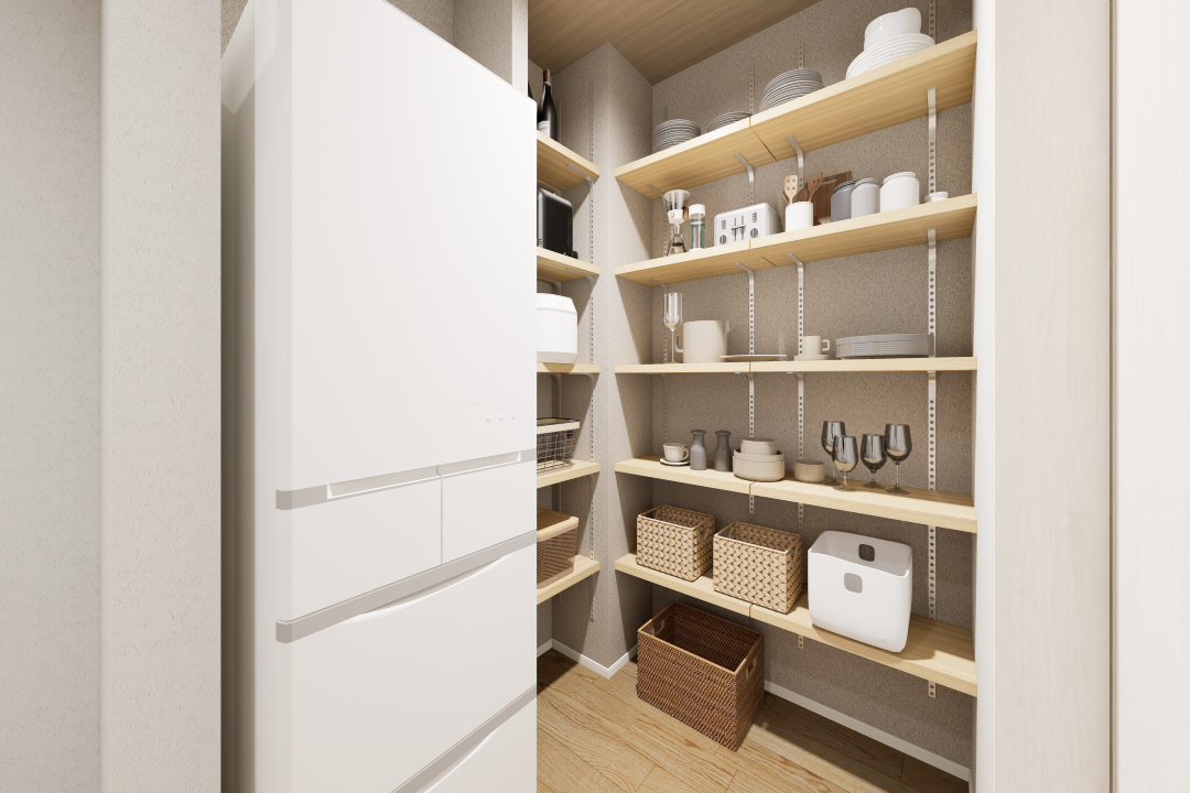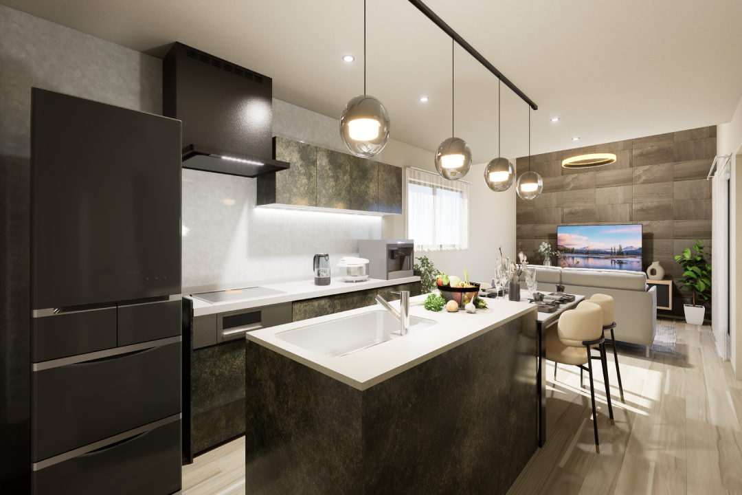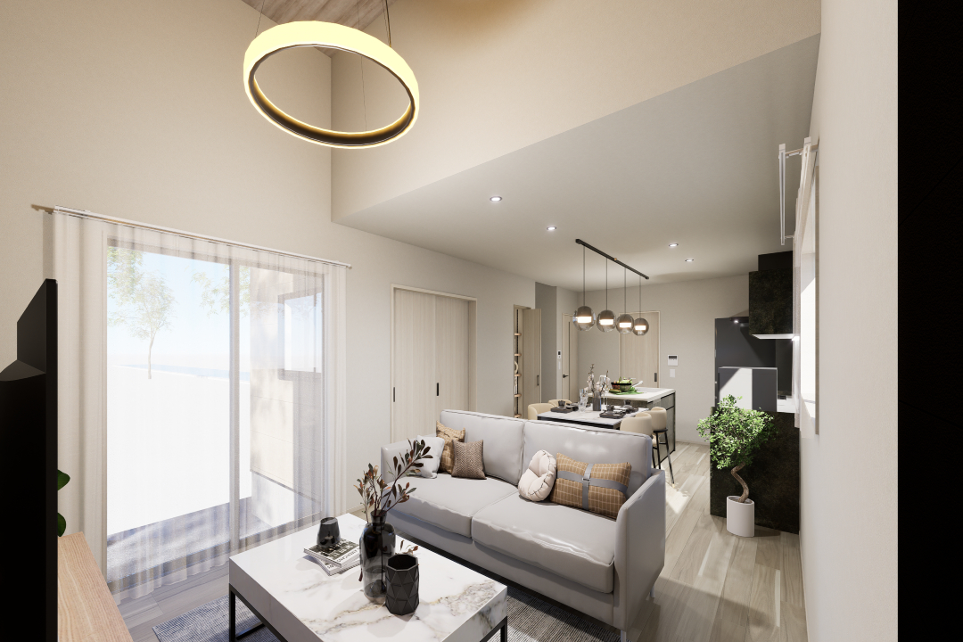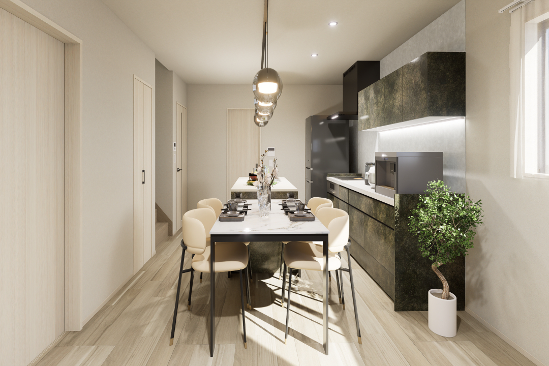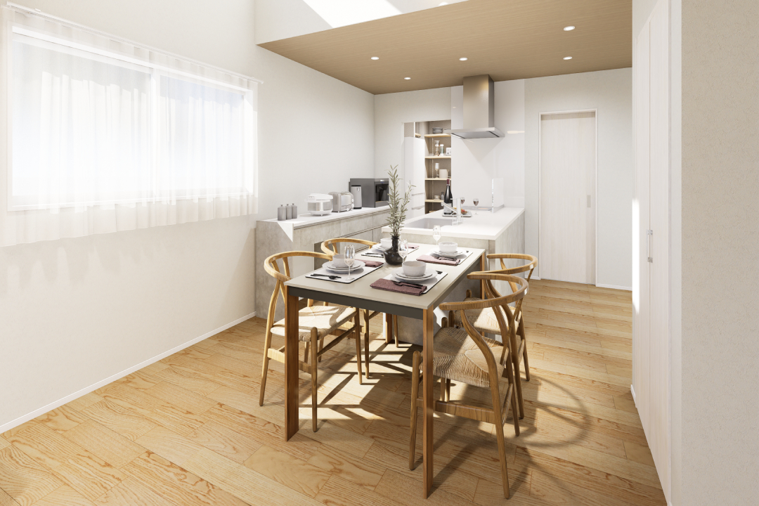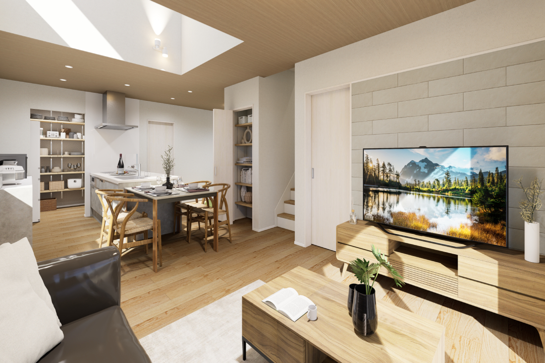 1号地…20.06帖のLDK。キッチン・パントリー・洗面浴室を行き来できる回遊動線。毎日の家事ラクをサポート◎