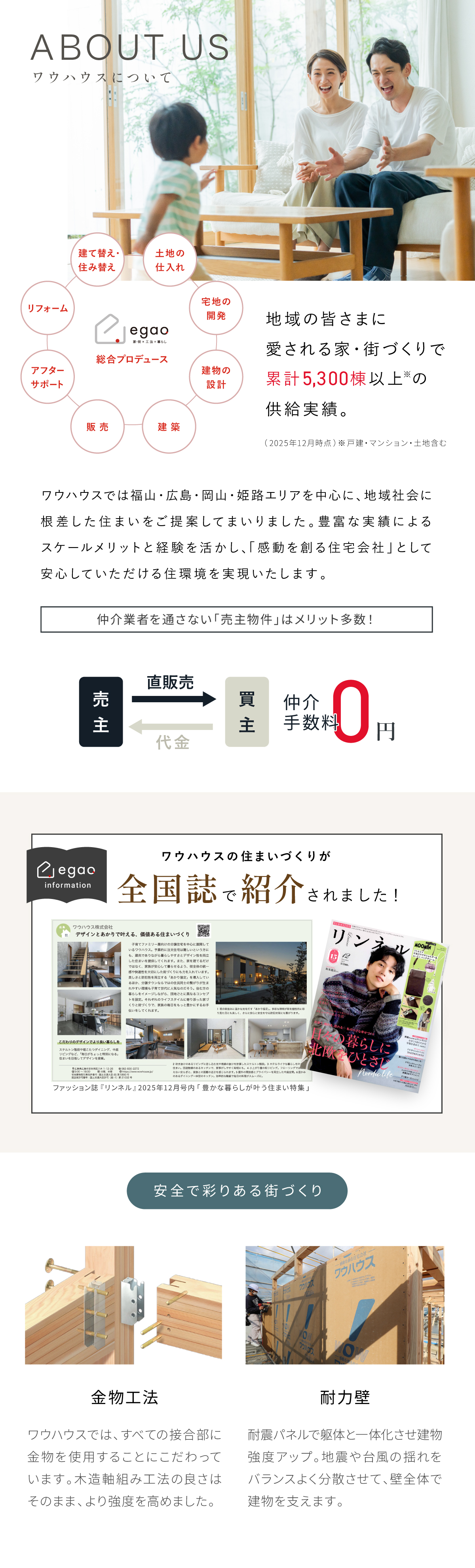 【概要】●所在地/広島県福山市高西町川尻3847●交通/JR山陽本線「東尾道」歩18分~19分●土地面積/151.26㎡・151.52㎡●建物面積/104.75㎡・114㎡●販売戸数/2棟●用途地域/1種住居●構造/木造2階建て(軸組構造)●建築確認番号/第R07認福広建セ00124号他●建築年月/2025年10月予定●販売価格/3,798万円・3,840万円●取引態様/売主●販売・設計・施工/ワウハウス株式会社