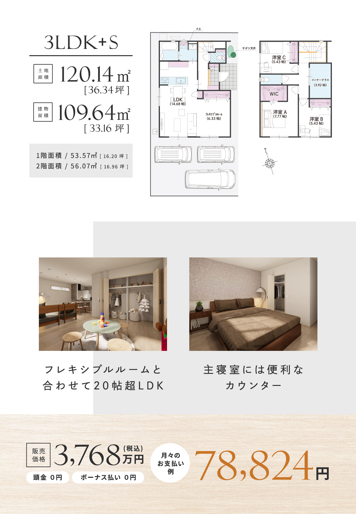 両親や友人ファミリーの来訪にも対応できる、ゆとりの駐車3台分。駐車場不足によるコインパーキング探しの手間がなく、気軽にお家に招待できます。また将来、子どもの成長に伴い増える車のニーズにも対応でき、さらに自転車やバイク置き場、BBQなど多用途に活用できる余白のある暮らしを叶える敷地です。
