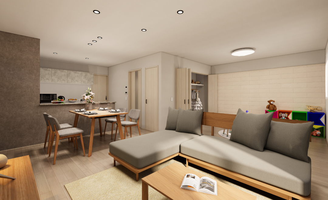 日用品やおもちゃ、季節家電などをすっきり収め、生活感を抑えた快適な空間を実現。子どもの成長による持ち物の増加にも柔軟に対応でき、季節物や大型品の管理もスムーズ。使う場所に適切な収納を配置することで、無駄なく使いやすい住まいを叶えました。