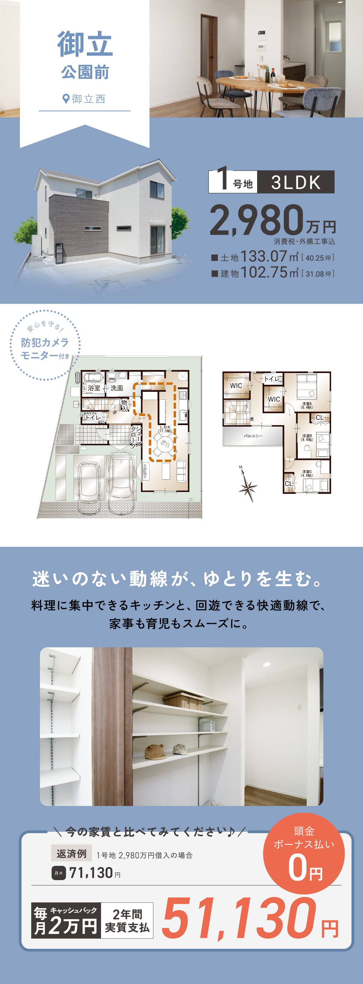 【御立公園前】●姫路市御立西6丁目●交通/JR姫新線「余部」駅徒歩37分、神姫バス「御立南口」停徒歩6分●団地設備/電気(関西電力)、水道(公営)、排水(汚水・雑排水=公共下水、雨水=道路側溝へ放流)、都市ガス●団地総面積・総区画数/22708.50㎡・20区画●私道負担/なし●地目/宅地●用途地域/第ニ種低層住居専用地域●建ぺい率/60% ●容積率/150% ●造成工事/完了済み ●手付金等の保証機関/株式会社広島銀行●取引態様/売主●分譲住宅販売戸数/3戸●構造/木造2階一戸建住宅(ガルバリウム葺※カラーベストの場合もあります/現場打ち鉄筋コンクリートベタ基礎/電化住宅)●建物設備/境界ブロック・フェンス(道路面除く)Low-E複層ガラス、TVインターホン、洗面化粧台、ユニットバス(浴室換気乾燥暖房機付)、システムキッチン、3カ所給湯設備(台所、洗面、浴室)、フローリング床(廊下、洋室、リビング、ダイニング)、各居室コンセント、ACコンセント、TVコンセント、電話用空配管、照明器具(各居室、ポーチ灯、浴室、キッチン、洗面所、トイレ)防腐・防蟻工事他●販売価格/1号地2,980万円/3LDK/延床面積102.75㎡/土地面積133.07㎡(2022年12月完成済)