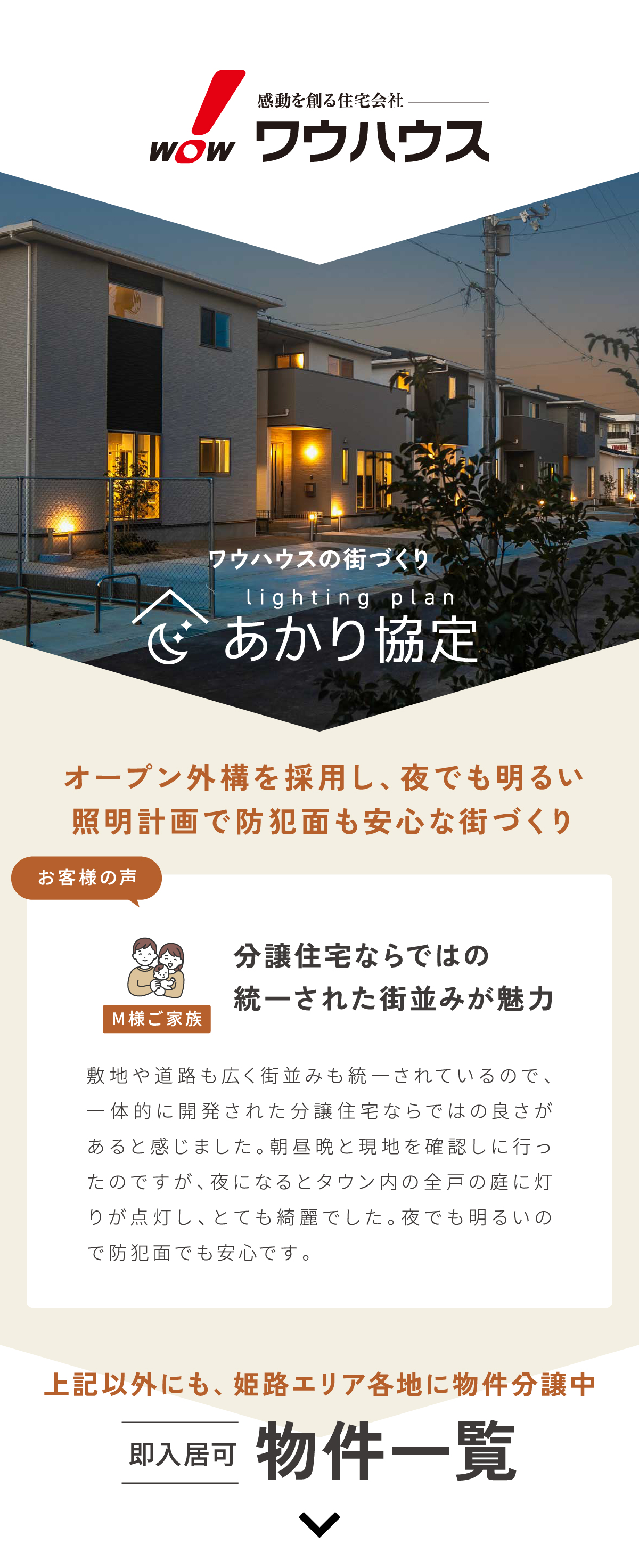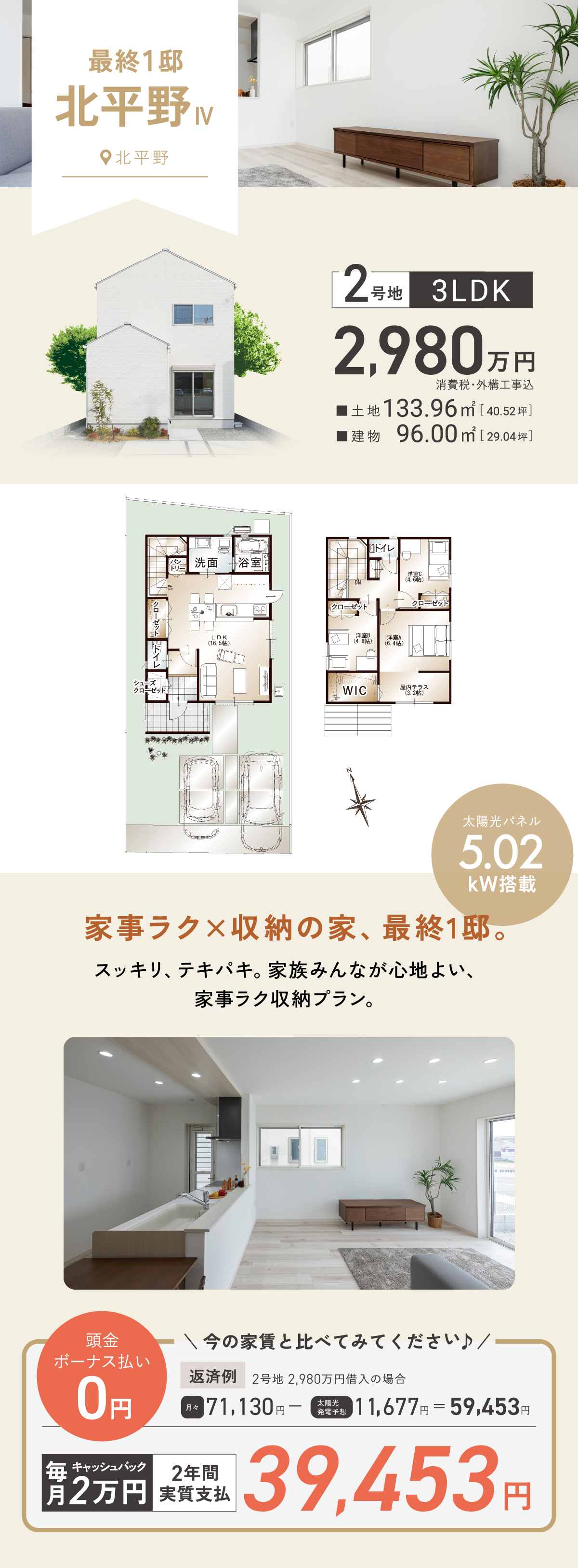 【北平野Ⅳ】●所在地/姫路市北平野2丁目●交通/JR播但線「野里」駅徒歩25分、神姫バス「北平野」停徒歩1分●団地設備/電気(関西電力)、水道(公営)、排水(汚水・雑排水=公共下水、雨水=道路側溝へ放流)●団地総面積・総区画数406.65㎡・3区画●私道負担なし●地目/宅地●用途地域/第一種中高層住居専用地域●建ぺい率/60%●容積率/200%●造成工事/完了済み●手付金等の保証機関/株式会社広島銀行●取引態様/売主●分譲住宅販売戸数/1戸(2号地モデルハウス)●構造/木造2階一戸建住宅(ガルバリウム葺/現場打ち鉄筋コンクリートベタ基礎/電化住宅)●建物設備/境界ブロック・フェンス(道路面除く)、Low-E複層ガラス、TVインターホン、洗面化粧台、ユニットバス(浴室換気乾燥暖房機付)、システムキッチン、3カ所給湯設備(台所、洗面、浴室)、フローリング床(廊下、洋室、リビング、ダイニング)、各居室コンセント、ACコンセント、TVコンセント、電話用空配管、LED照明器具(各居室、ポーチ灯、浴室、キッチン、洗面所、トイレ)防腐・防蟻工事他●販売価格/2号地:2,980万円(税込/3LDK/延床面積96㎡/土地面積133.96㎡付/2023年11月完成済)