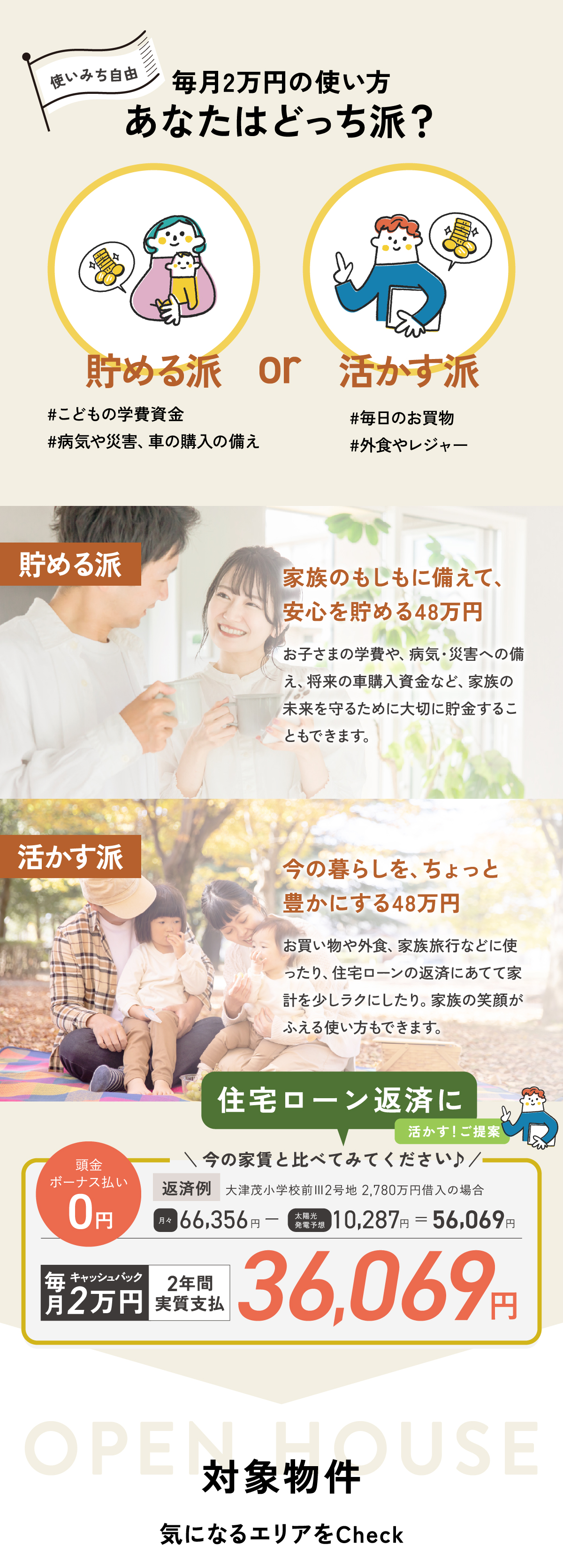 【お支払い例について】※40年返済、変動金利0.695%の場合でのお支払い例です。※1~4年目のシミュレーションです。お客様の生活パターン・機器の使い方・省エネルギー機器の種類・燃料価格や季節による変動・機能の変化などその他の要因等により変動するため、実際の結果を保証するものではなく、あくまで目安としてご利用下さい。