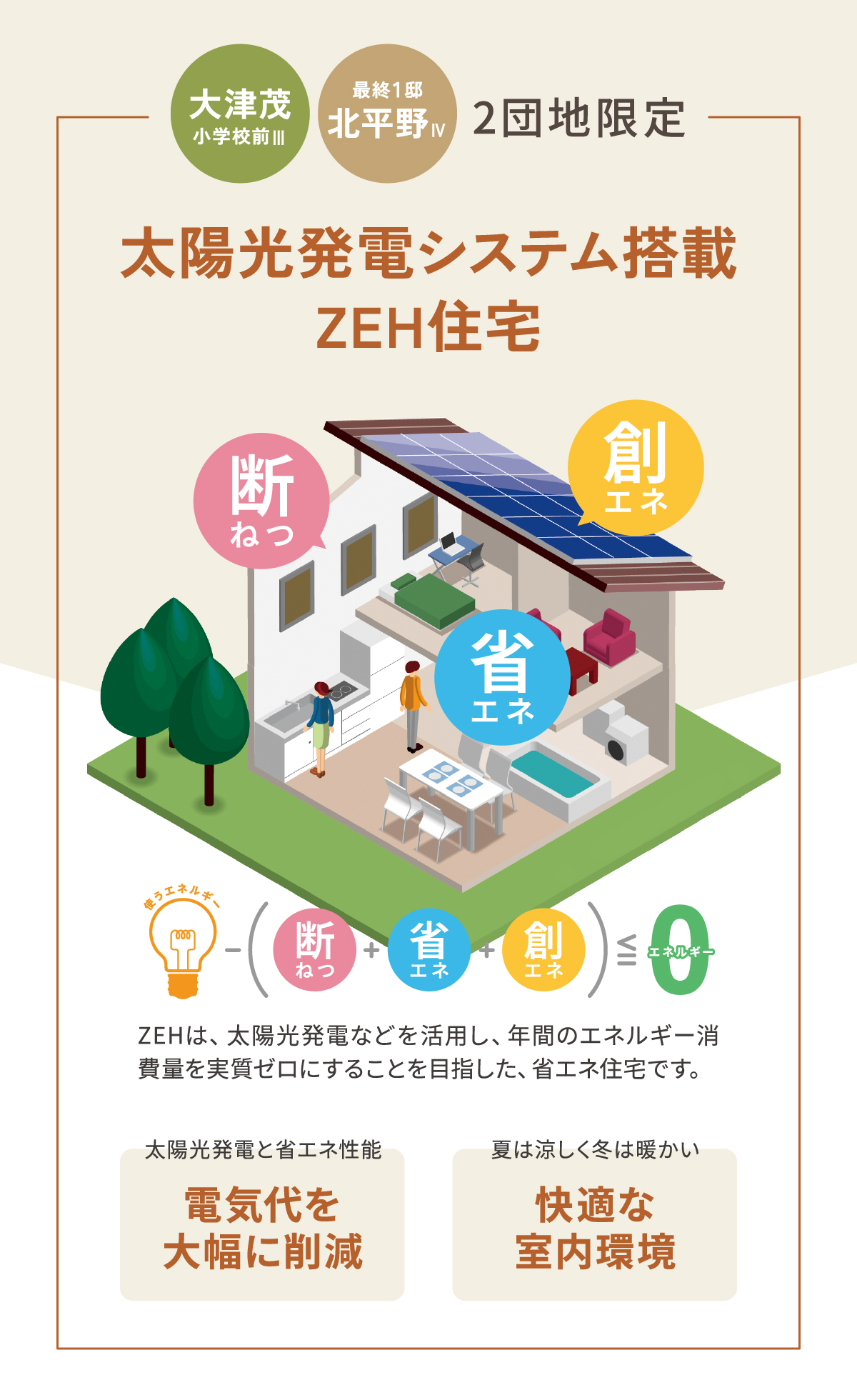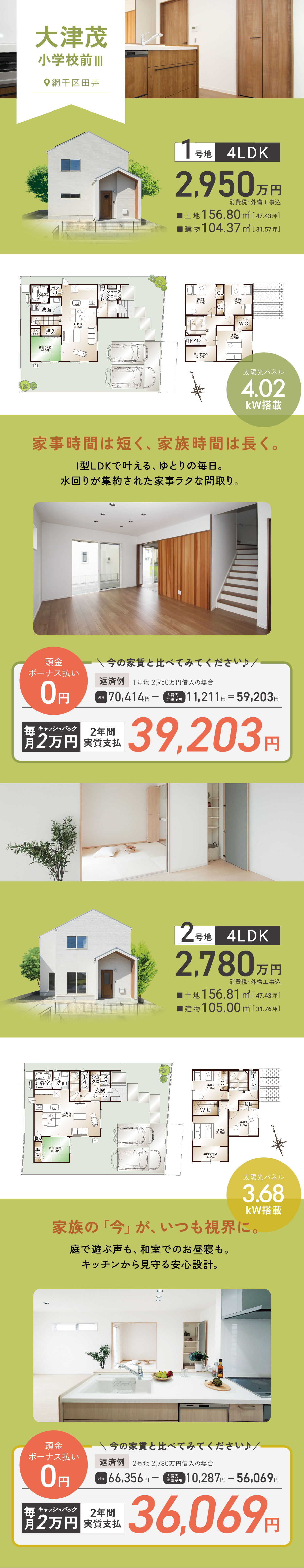 【大津茂小学校前Ⅲ】●所在地/姫路市網干区田井255●交通/JR西日本「はりま勝原」駅徒歩28分、神姫バス「宮田団地前」停徒歩7分●団地設備/電気(関西電力)、水道(公営)、排水(汚水・雑排水=公共下水、雨水=道路側溝へ放流)、都市ガス●団地総面積・総区画数/470.37㎡・3区画●私道負担なし●地目/宅地●用途地域/第一種中高層住居専用地域●建ぺい率/60%●容積率/150%●造成工事/完了済み●手付金等の保証機関/株式会社広島銀行●取引態様/売主●分譲住宅販売戸数/2戸(1・2号地モデルハウス)●構造/木造2階一戸建住宅(カラーベスト葺/現場打ち鉄筋コンクリートベタ基礎/電化住宅)●建物設備/境界ブロック・フェンス(道路面除く)、Low-E複層ガラス、TVインターホン、洗面化粧台、ユニットバス(浴室換気乾燥暖房機付)、システムキッチン、3カ所給湯設備(台所、洗面、浴室)、フローリング床(廊下、洋室、リビング、ダイニング)、各居室コンセント、ACコンセント、TVコンセント、電話用空配管、LED照明器具(各居室、ポーチ灯、浴室、キッチン、洗面所、トイレ)防腐・防蟻工事他●販売価格/1号地:2,950万円(税込/4LDK/延床面積104.37㎡/土地面積156.80㎡付/2023年9月完成済)、2号地:2,780万円(税込/4LDK/延床面積105.00㎡/土地面積156.81㎡付/2023年9月完成済)