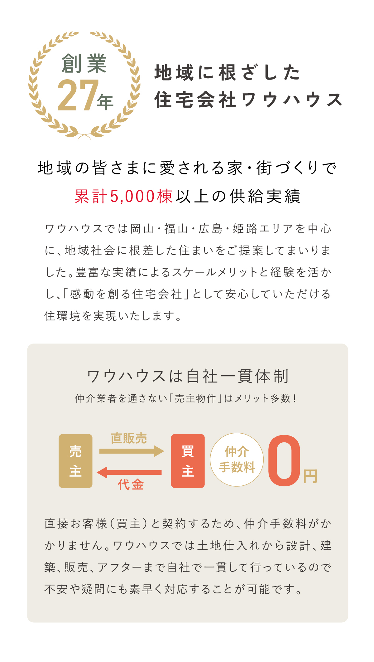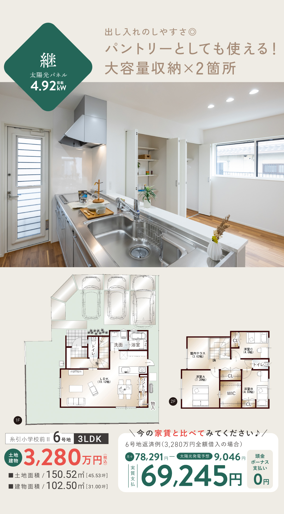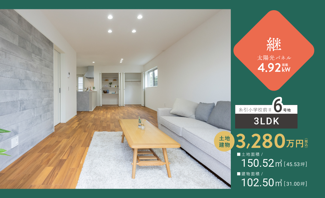 【糸引小学校前Ⅱ】●所在地/姫路市継●交通/山陽電鉄本線「白浜の宮」駅徒歩17分・「八家」駅徒歩17分、神姫バス「糸引小学校前」停徒歩5分●団地設備/電気(関西電力)、水道(公営)、排水(汚水・雑排水=公共下水、雨水=道路側溝へ放流)●団地総面積・総区画数929.92㎡・6区画●私道負担なし●地目/宅地●用途地域/第一種・第二種中高層住居専用地●建ぺい率/60%●容積率/200%●造成工事/完了済み●手付金等の保証機関/株式会社広島銀行●取引態様/売主●構造/木造2階一戸建住宅(ガルバリウム葺/現場打ち鉄筋コンクリートベタ基礎/電化住宅)●建物設備/境界ブロック・フェンス(道路面除く)、Low-E複層ガラス、TVインターホン、洗面化粧台、ユニットバス(浴室換気乾燥暖房機付)、システムキッチン、3カ所給湯設備(台所、洗面、浴室)、フローリング床(廊下、洋室、リビング、ダイニング)、各居室コンセント、ACコンセント、TVコンセント、電話用空配管、LED照明器具(各居室、ポーチ灯、浴室、キッチン、洗面所、トイレ)防腐・防蟻工事他6号地:3,280万円(税込/3LDK/延床面積102.50㎡/土地面積150.52㎡/2024年11月完成済)