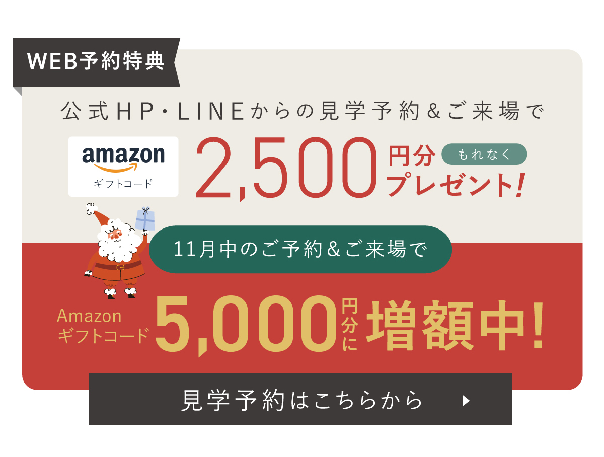 【ギフトカード特典の対象となる方】はじめてワウハウスの店舗および物件にご来場される方で、ご来場アンケートにご協力いただける方に「2,000円分」、LINEお友達にご登録いただくとさらに「500円分」進呈いたします。※同居のご家族1組につき、1回限りとさせていただきます。※複数物件へご来場いただいた場合でも、ご来場プレゼントは1回限りの進呈とさせていただきます。※お電話やポータルサイト等、公式サイトの予約フォーム以外からのご予約は対象外となります。 ※本特典はワウハウスによる提供です。本特典についてのお問い合わせはAmazonではお受けしておりません。※Amazon、Amazon.co.jpおよびそれらのロゴはAmazon.com, Inc. またはその関連会社の商標です。