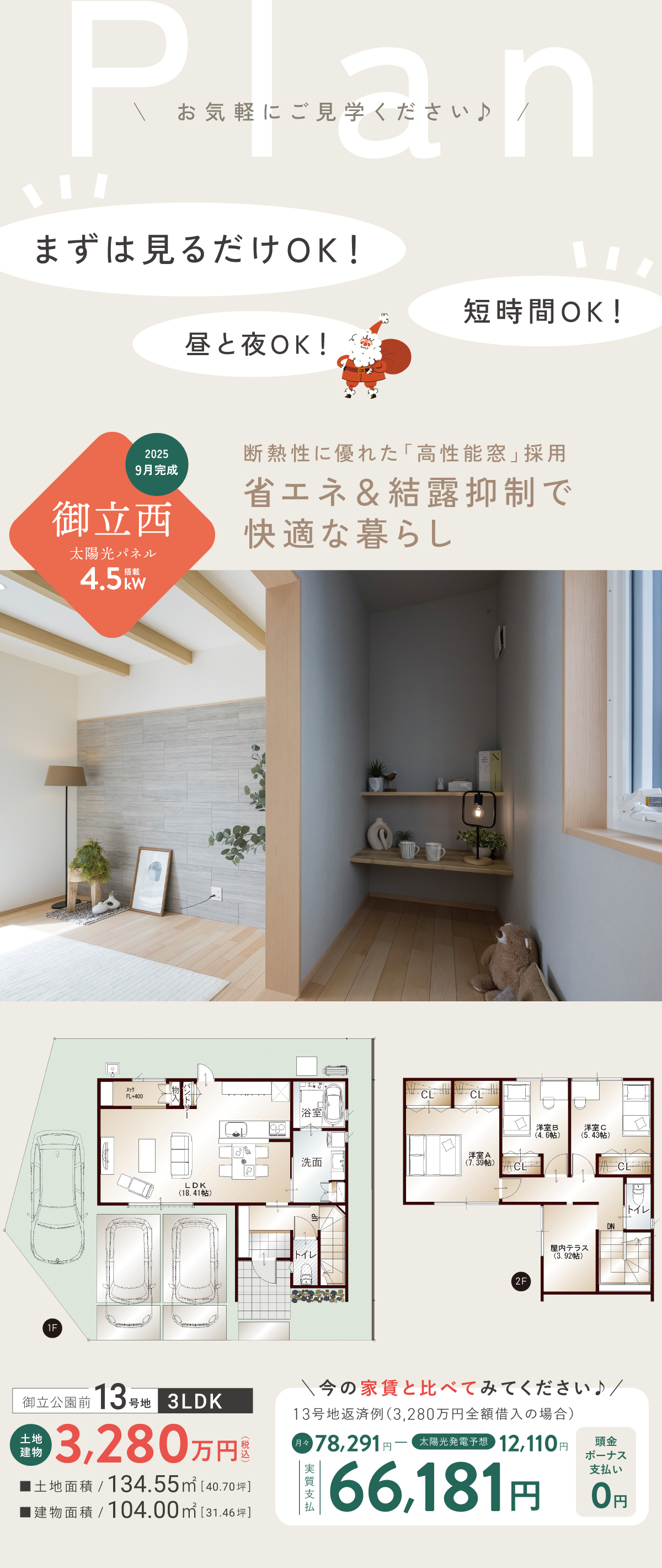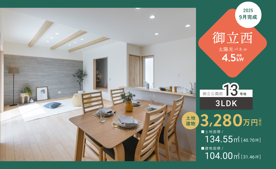 【概要】【御立公園前】●姫路市御立西6丁目●交通/JR姫新線「余部」駅徒歩37分、神姫バス「御立南口」停徒歩6分●団地設備/電気(関西電力)、水道(公営)、排水(汚水・雑排水=公共下水、雨水=道路側溝へ放流)、都市ガス●団地総面積・総区画数/22708.50㎡・20区画●私道負担/なし●地目/宅地●用途地域/第ニ種低層住居専用地域●建ぺい率/60% ●容積率/150% ●造成工事/完了済み ●手付金等の保証機関/株式会社広島銀行●取引態様/売主●構造/木造2階一戸建住宅(ガルバリウム葺/現場打ち鉄筋コンクリートベタ基礎/電化住宅)●建物設備/境界ブロック・フェンス(道路面除く)Low-E複層ガラス(高性能樹脂窓)、TVインターホン、洗面化粧台、ユニットバス(浴室換気乾燥暖房機付)、システムキッチン、3カ所給湯設備(台所、洗面、浴室)、フローリング床(廊下、洋室、リビング、ダイニング)、各居室コンセント、ACコンセント、TVコンセント、電話用空配管、照明器具(各居室、ポーチ灯、浴室、キッチン、洗面所、トイレ)防腐・防蟻工事他●販売価格/13号地3,280万円/3LDK/延床面積104㎡/土地面積134.55㎡(2025年9月完成済)