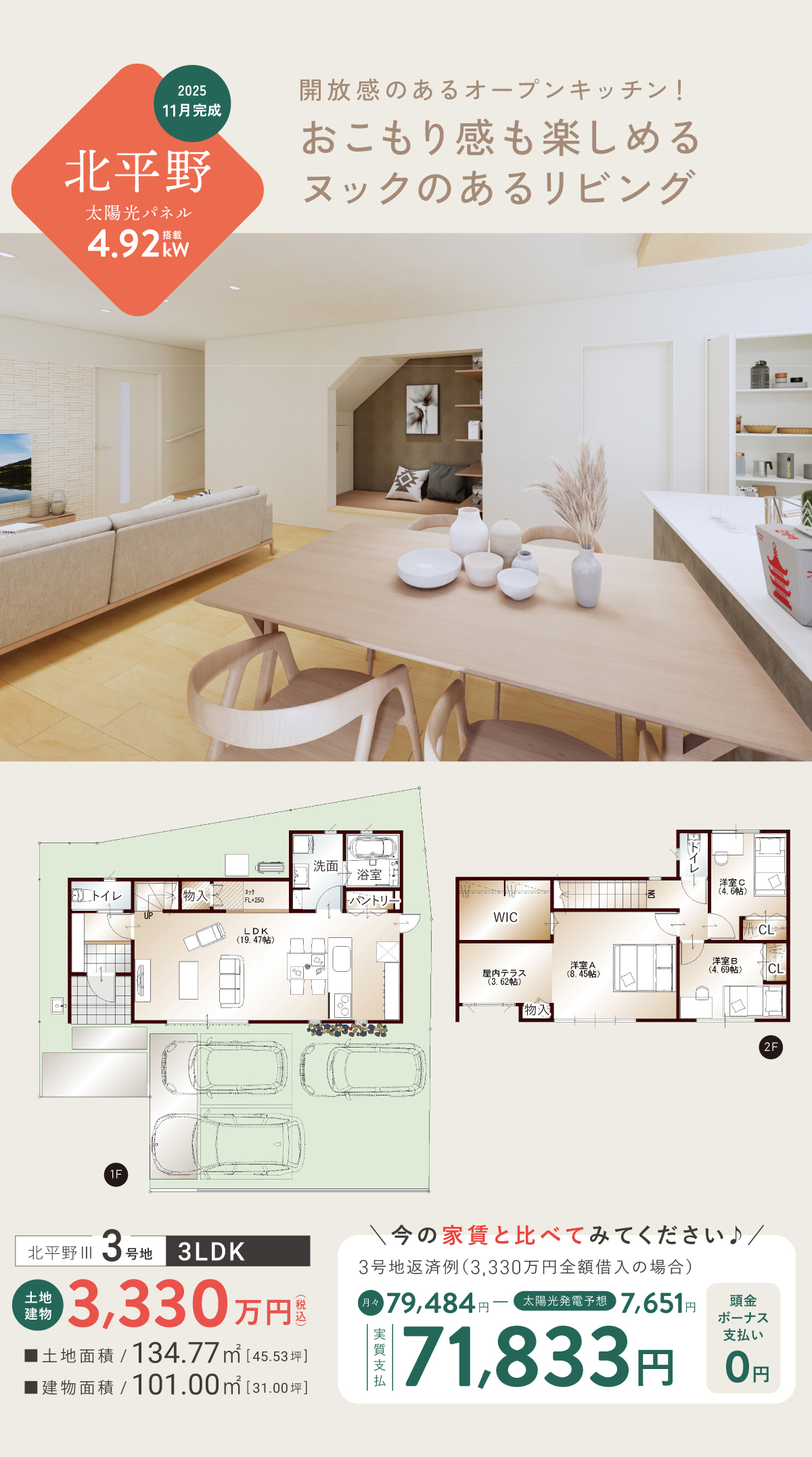 【北平野Ⅲ】●所在地/姫路市北平野1丁目●交通/JR播但線「野里」駅徒歩20分、神姫バス「広嶺中学校前」停徒歩5分●団地設備/電気(関西電力)、水道(公営)、排水(汚水・雑排水=公共下水、雨水=道路側溝へ放流)●団地総面積・総区画数901.94㎡・7区画●私道負担あり/位置指定道路(持分1/7ずつ)●地目/宅地●用途地域/第1種住居地域●建ぺい率/60%●容積率/200%●造成工事/完了済み●手付金等の保証機関/株式会社広島銀行●取引態様/売主●分譲住宅販売戸数/1戸●構造/木造2階一戸建住宅(ガルバリウム葺/現場打ち鉄筋コンクリートベタ基礎/電化住宅)●建物設備/境界ブロック・フェンス(道路面除く)、高性能樹脂窓、TVインターホン、洗面化粧台、ユニットバス(浴室換気乾燥暖房機付)、システムキッチン、3カ所給湯設備(台所、洗面、浴室)、フローリング床(廊下、洋室、リビング、ダイニング)、各居室コンセント、ACコンセント、TVコンセント、電話用空配管、LED照明器具(ポーチ灯、浴室、キッチン、洗面所、トイレ)防腐・防蟻工事他●販売価格/3号地:3,330万円(税込/3LDK/延床面積101.00㎡/土地面積134.77㎡付/2025年11月完成済)