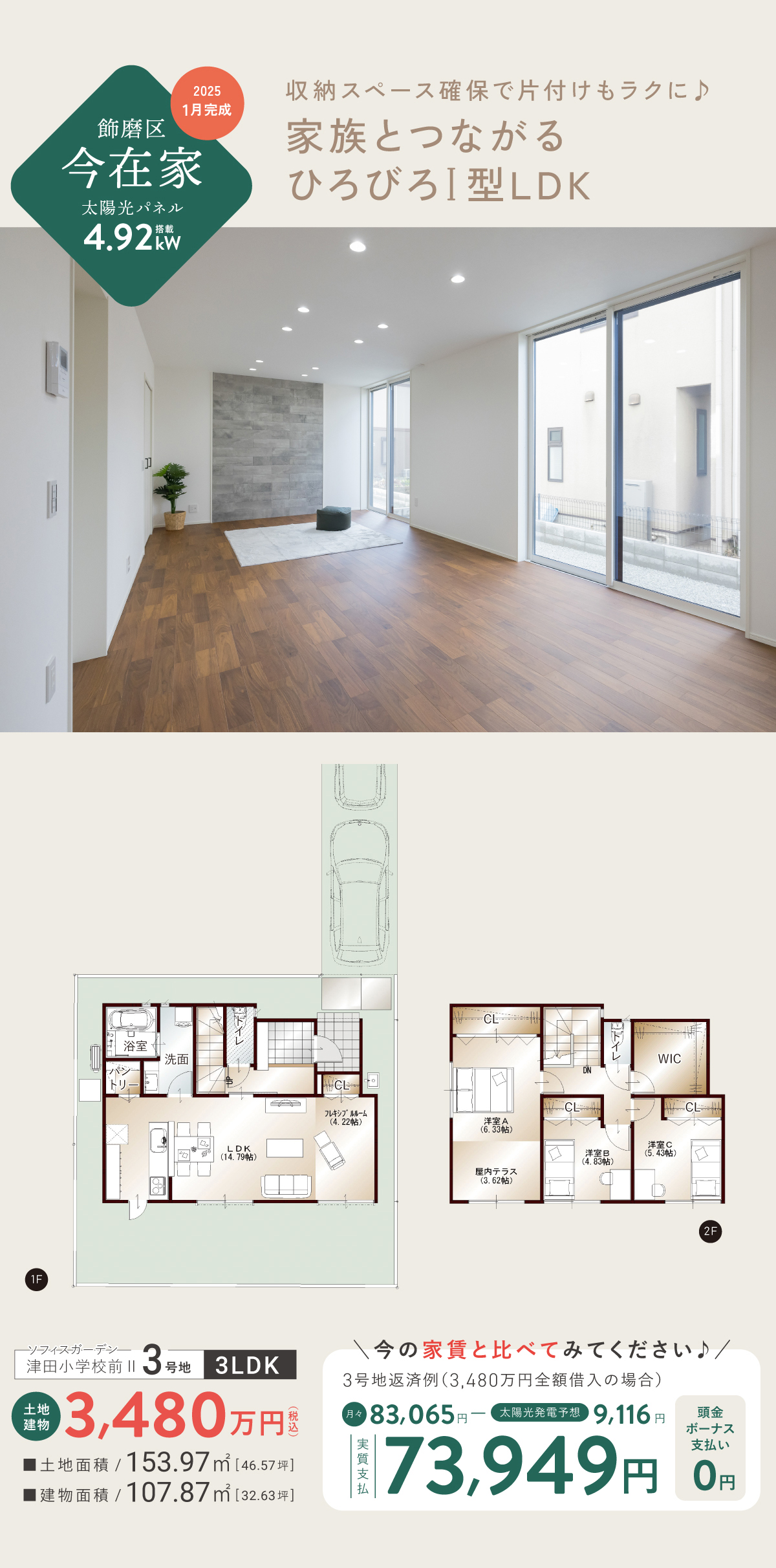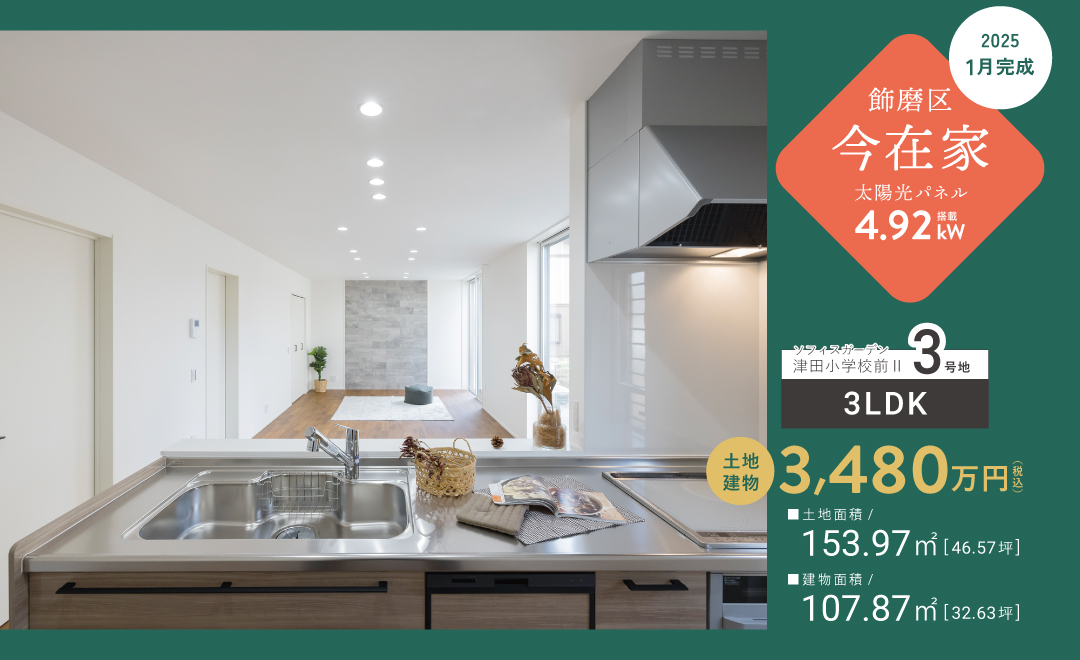 【ソフィスガーデン津田小学校前Ⅱ】●姫路市飾磨区今在家3丁目●交通/山陽電鉄本線「西飾磨」駅徒歩7分、神姫バス「津田幼稚園前」停徒歩5分●団地設備/電気(関西電力)、水道(公営)、排水(汚水・雑排水=公共下水、雨水=道路側溝へ放流)、都市ガス●団地総面積・総区画数/593.16㎡・4区画●私道負担/なし●地目/宅地●用途地域/第ニ種中高層住居専用地域●建ぺい率/60%●容積率/200%●造成工事/完了済み ●手付金等の保証機関/株式会社広島銀行●取引態様/売主●分譲住宅販売戸数/2戸●構造/木造2階一戸建住宅(ガルバリウム葺/現場打ち鉄筋コンクリートベタ基礎/電化住宅)●建物設備/境界ブロック・フェンス(道路面除く)Low-E複層ガラス、TVインターホン、洗面化粧台、ユニットバス(浴室換気乾燥暖房機付)、システムキッチン、3カ所給湯設備(台所、洗面、浴室)、フローリング床(廊下、洋室、リビング、ダイニング)、各居室コンセント、ACコンセント、TVコンセント、電話用空配管、照明器具(各居室、ポーチ灯、浴室、キッチン、洗面所、トイレ)防腐・防蟻工事他●販売価格/3号地3,480万円/3LDK/延床面積107.87㎡/土地面積153.97㎡(2025年1月完成済)