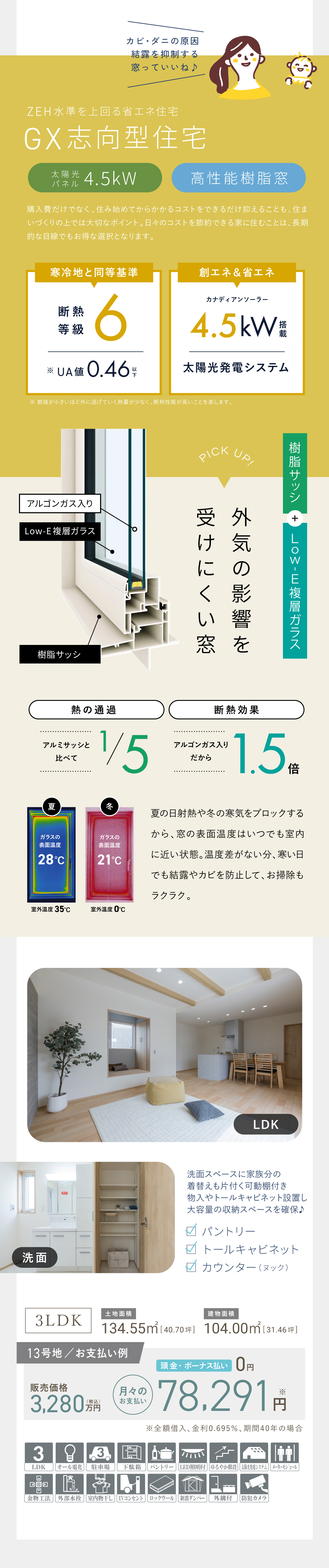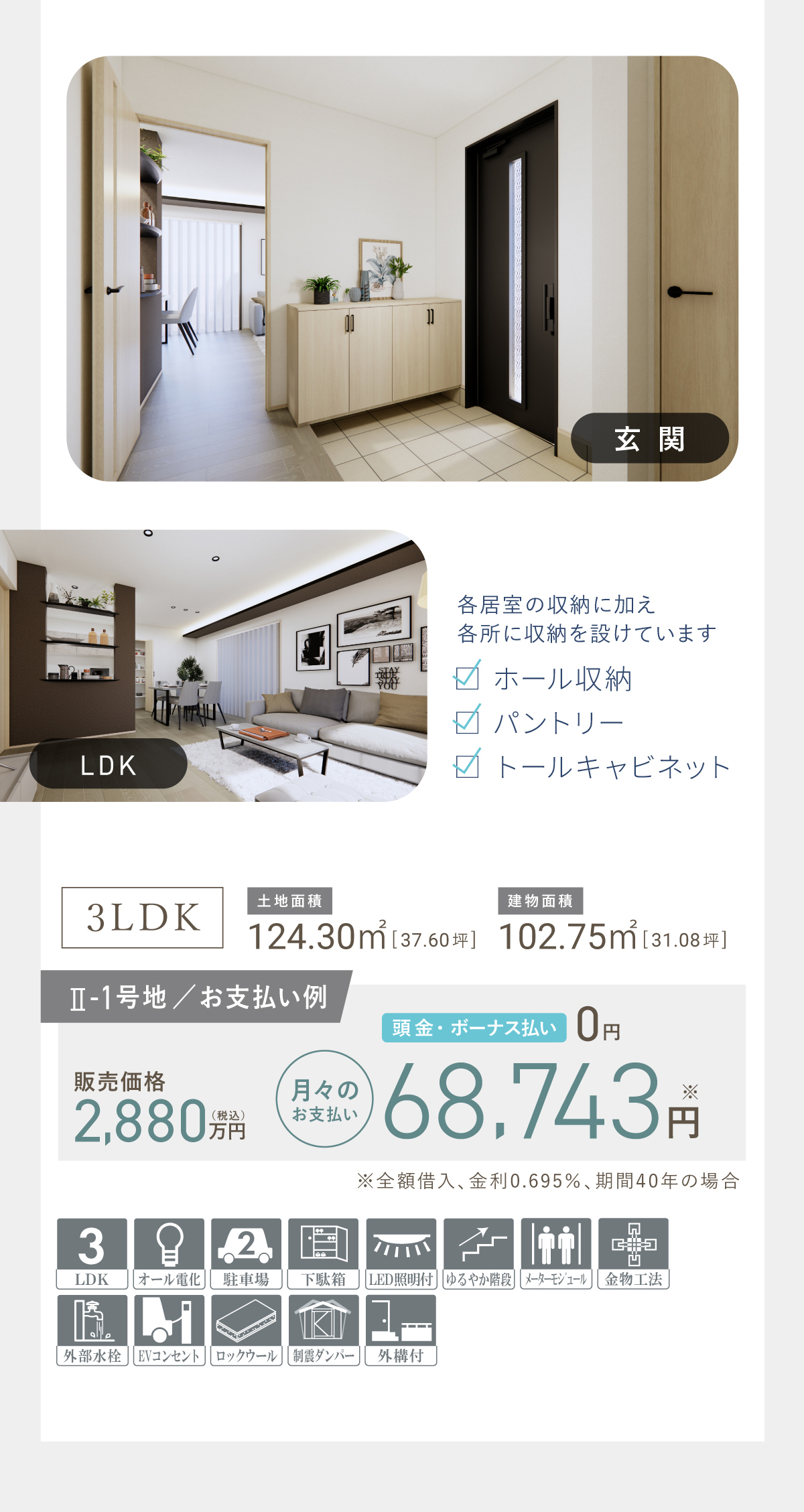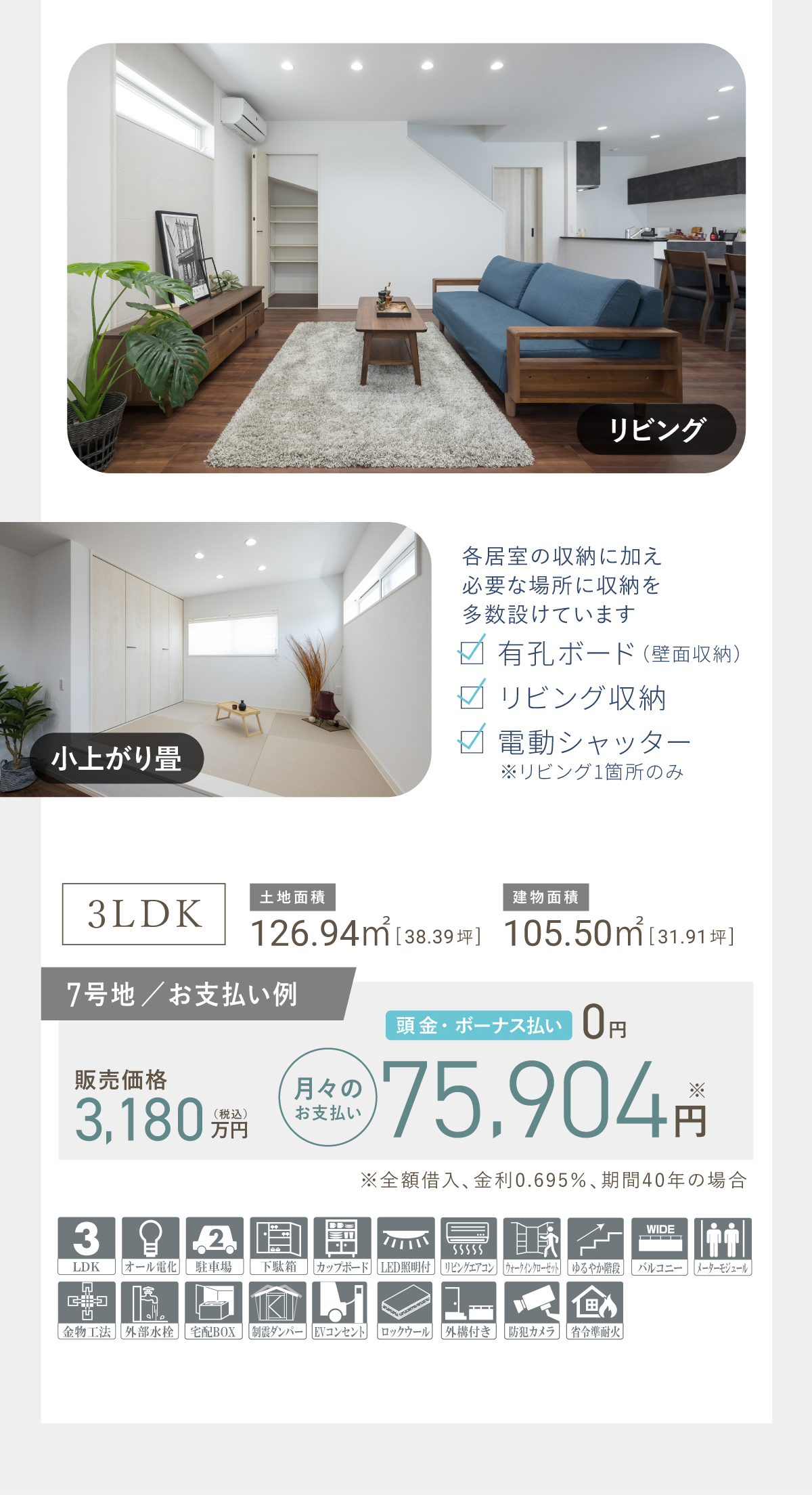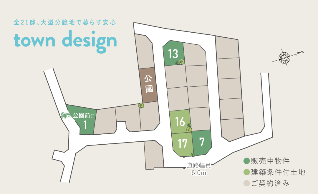 【概要】 【物件概要】●姫路市御立西6丁目●交通/JR姫新線「余部」駅徒歩37分、神姫バス「御立南口」停徒歩6分●団地設備/電気(関西電力)、水道(公営)、排水(汚水・雑排水=公共下水、雨水=道路側溝へ放流)、都市ガス●団地総面積・総区画数/22708.50㎡・21区画●私道負担/なし●地目/宅地●用途地域/第ニ種低層住居専用地域●建ぺい率/60% ●容積率/150% ●造成工事/完了済み ●手付金等の保証機関/株式会社広島銀行●取引態様/売主●分譲住宅販売戸数/3戸●構造/木造2階一戸建住宅(ガルバリウム葺※カラーベストの場合もあります/現場打ち鉄筋コンクリートベタ基礎/電化住宅)●建物設備/境界ブロック・フェンス(道路面除く)Low-E複層ガラス※13号地のみ高性能樹脂窓、TVインターホン、洗面化粧台、ユニットバス(浴室換気乾燥暖房機付)、システムキッチン、3カ所給湯設備(台所、洗面、浴室)、フローリング床(廊下、洋室、リビング、ダイニング)、各居室コンセント、ACコンセント、TVコンセント、電話用空配管、照明器具(各居室、ポーチ灯、浴室、キッチン、洗面所、トイレ)防腐・防蟻工事他●販売価格/Ⅱ-1号地2,880万円/3LDK/延床面積102.75㎡/土地面積124.30㎡(2025年9月完成予定HK25-10546)7号地3,180万円/3LDK/延床面積105.50㎡/土地面積126.94㎡(2022年12月完成済)13号地3,280万円/3LDK/延床面積104.00㎡/土地面積134.55㎡(2025年9月完成)