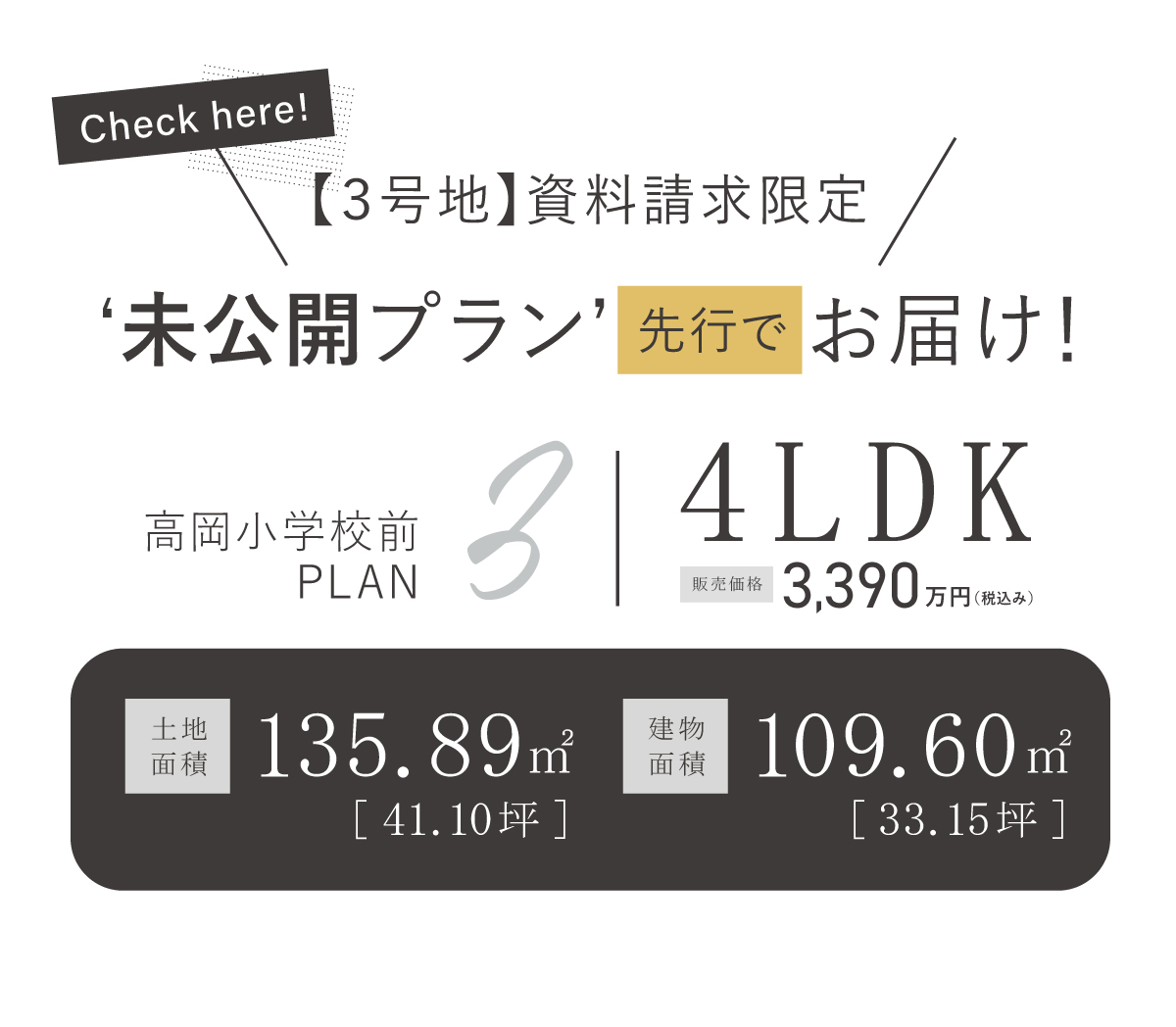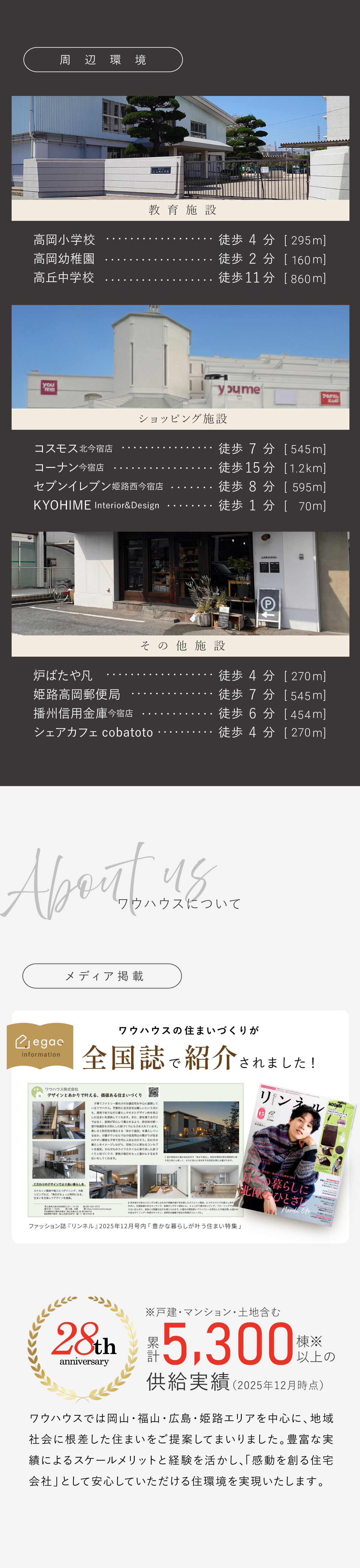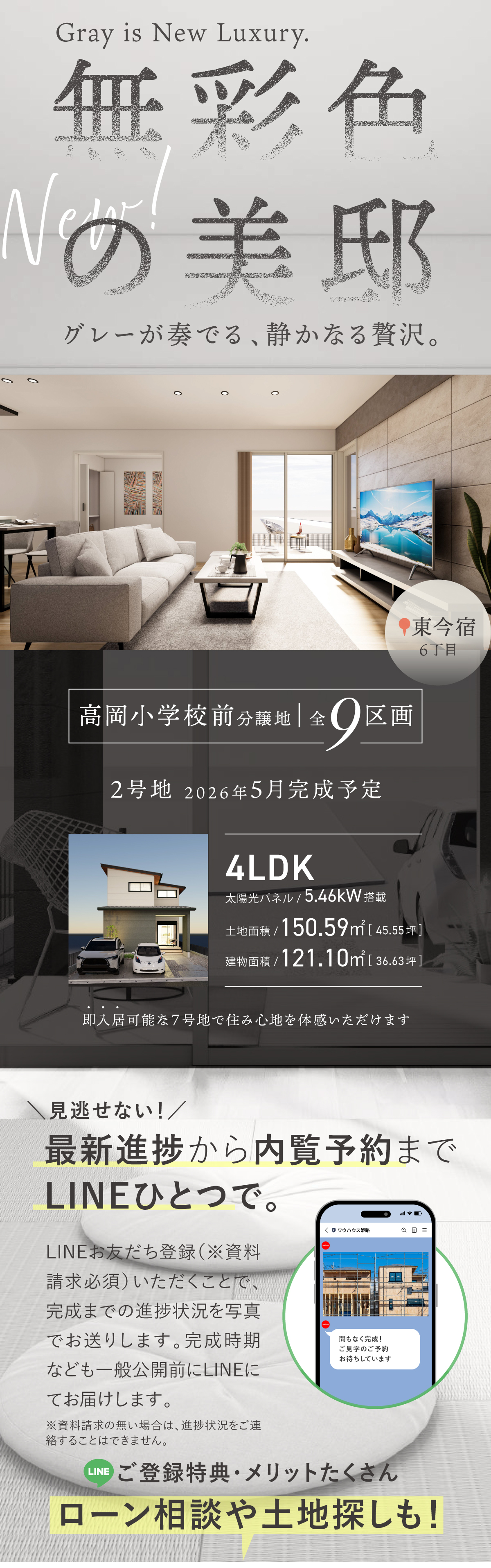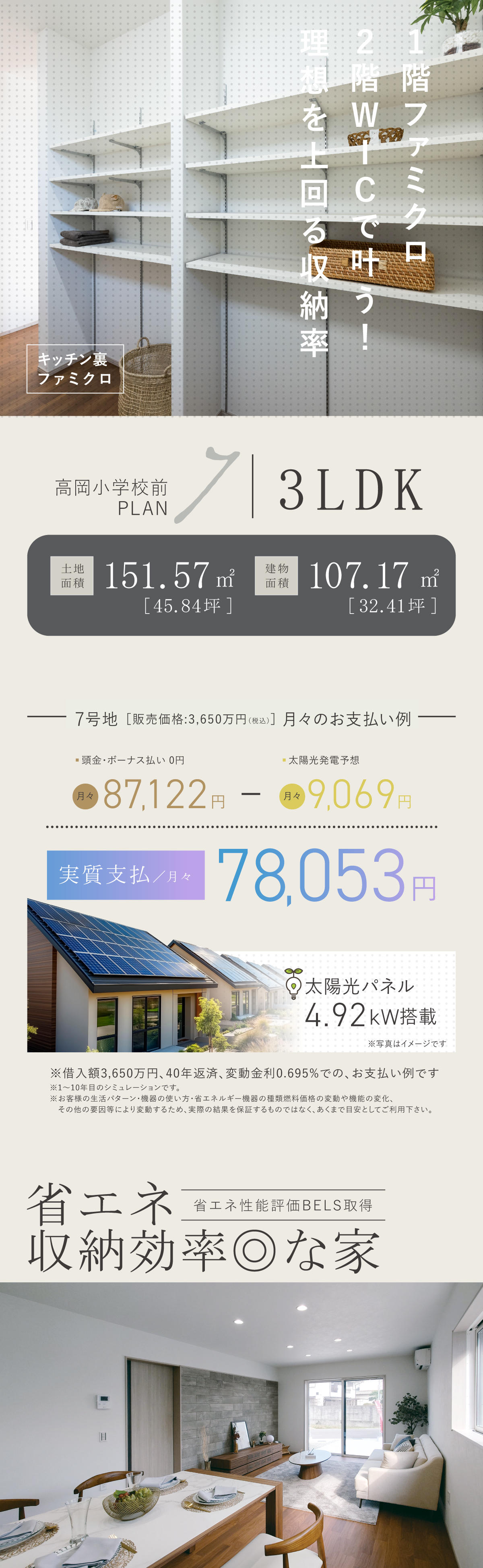 【概要】●所在地/姫路市東今宿6丁目●交通/JR姫新線「播磨高岡駅」徒歩12分、神姫バス「今宿」停徒歩9分●団地設備/電気(関西電力)、水道(公営)、排水(汚水・雑排水=公共下水、雨水=道路側溝へ放流)●総区画数/9区画●販売戸数/3戸(2・3・7号地)●販売価格/2号地3,990万円(税込)・敷地面積/150.59㎡・建物面積/121.10㎡、3号地(建築予定HK23-12585)3,390万円(税込)・敷地面積/135.89㎡・建物面積/109.60㎡、7号地3,650万円(税込)・敷地面積/151.57㎡・建物面積/107.17㎡●私道負担/なし●地目/宅地●用途地域/第一種中高層住居専用地域●建ぺい率/60%●容積率/200%●完成年月/2024年11月下旬(7号地)●手付金等の保証機関/株式会社広島銀行●取引態様/売主●構造/木造2階一戸建住宅(ガルバリウム葺/現場打ち鉄筋コンクリートベタ基礎/電化住宅)●建物設備/境界ブロック・フェンス(道路面除く)、Low-E複層ガラス、TVインターホン、洗面化粧台、ユニットバス(浴室換気乾燥暖房機付)、システムキッチン、3カ所給湯設備(台所、洗面、浴室)、フローリング床(廊下、洋室、リビング、ダイニング)、各居室コンセント、ACコンセント、TVコンセント、電話用空配管、LED照明器具(各居室、ポーチ灯、浴室、キッチン、洗面所、トイレ)防腐・防蟻工事他
