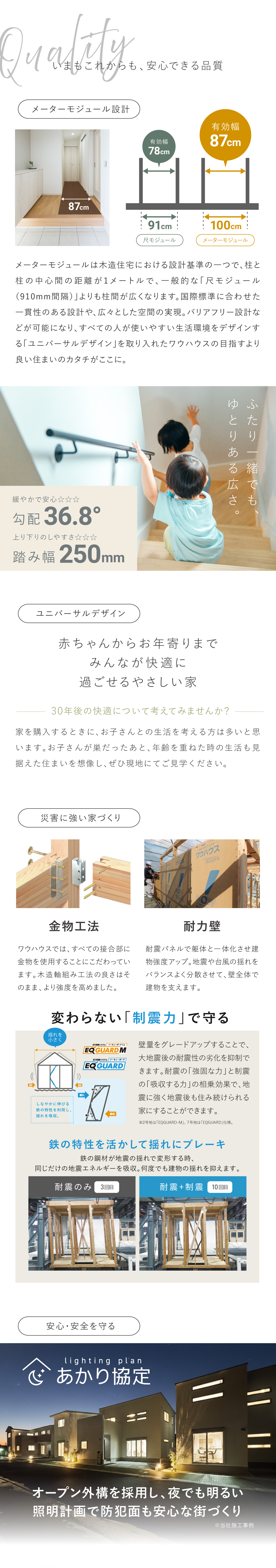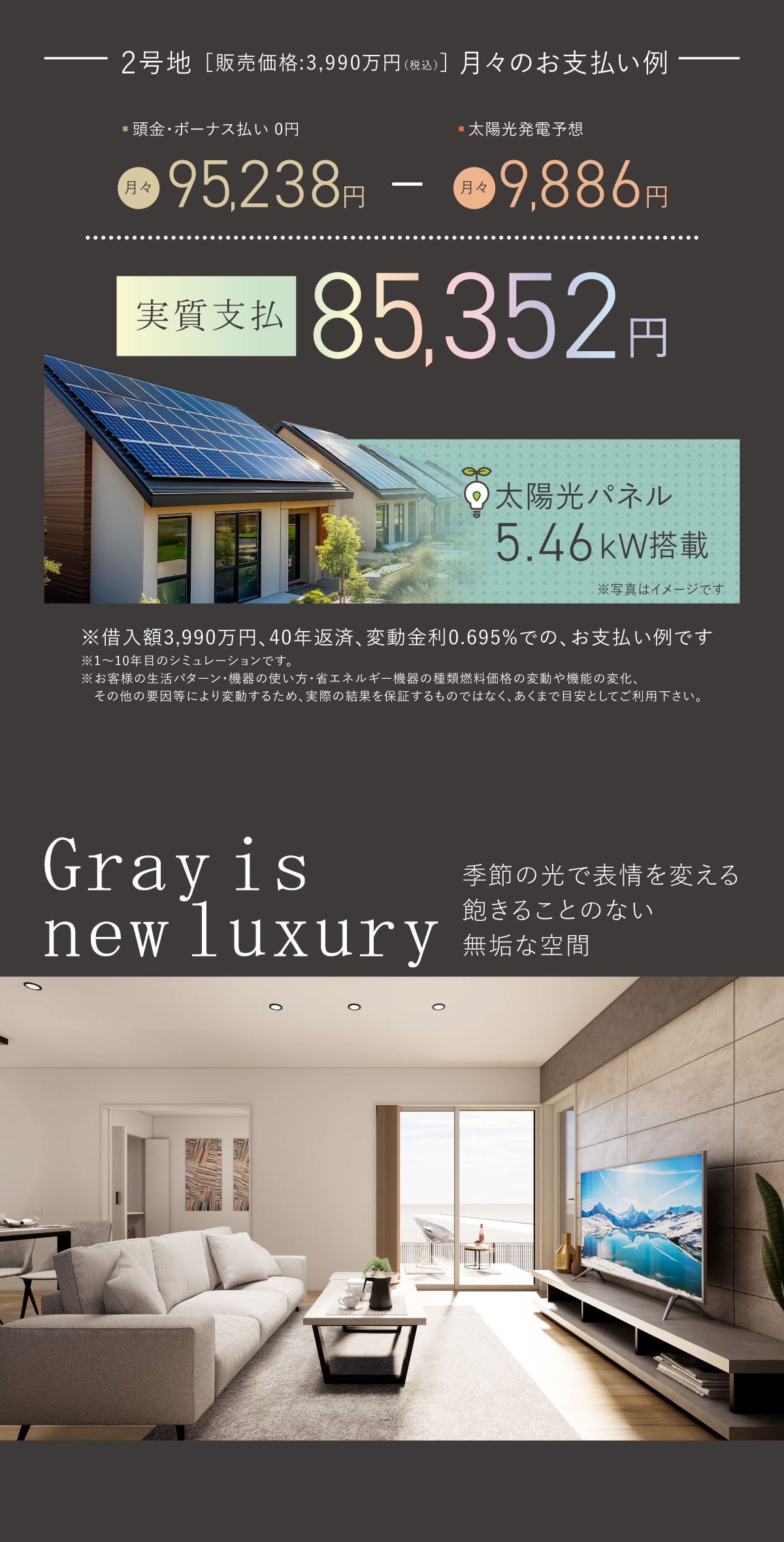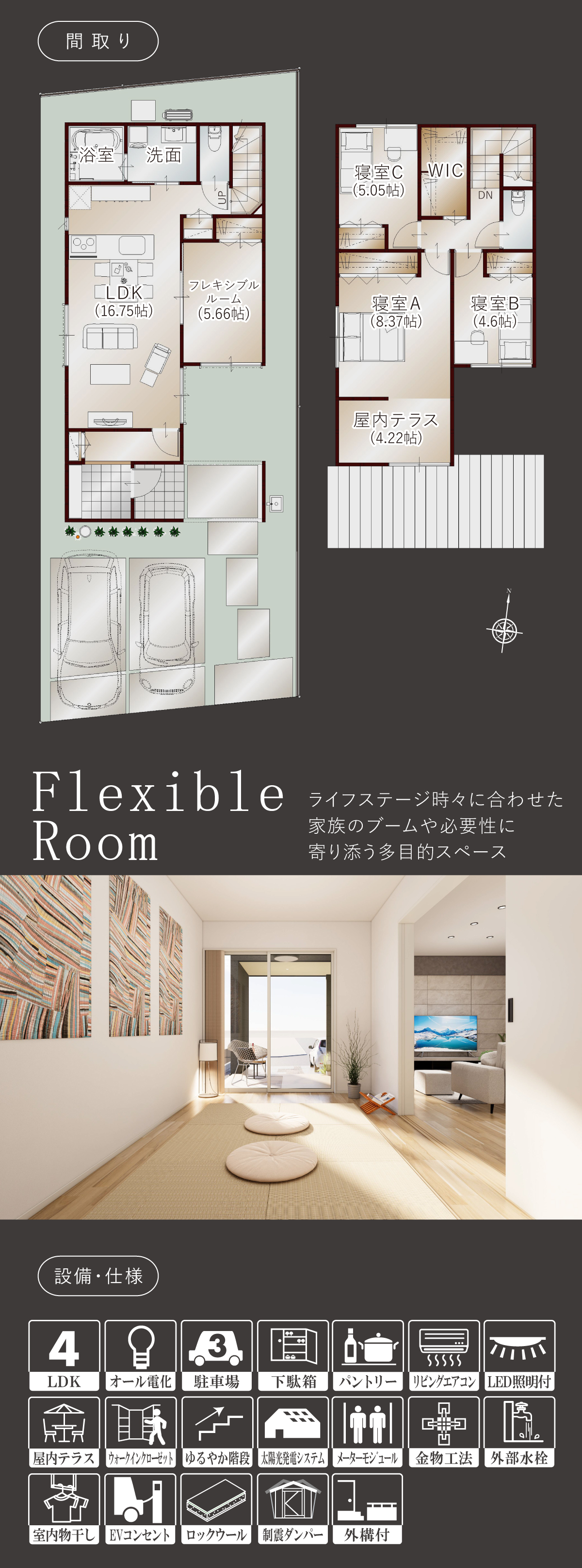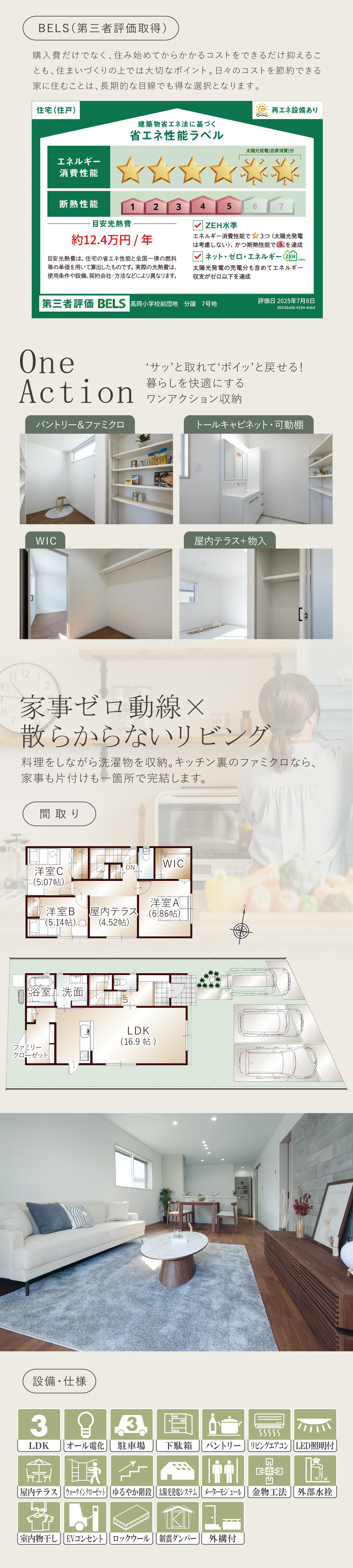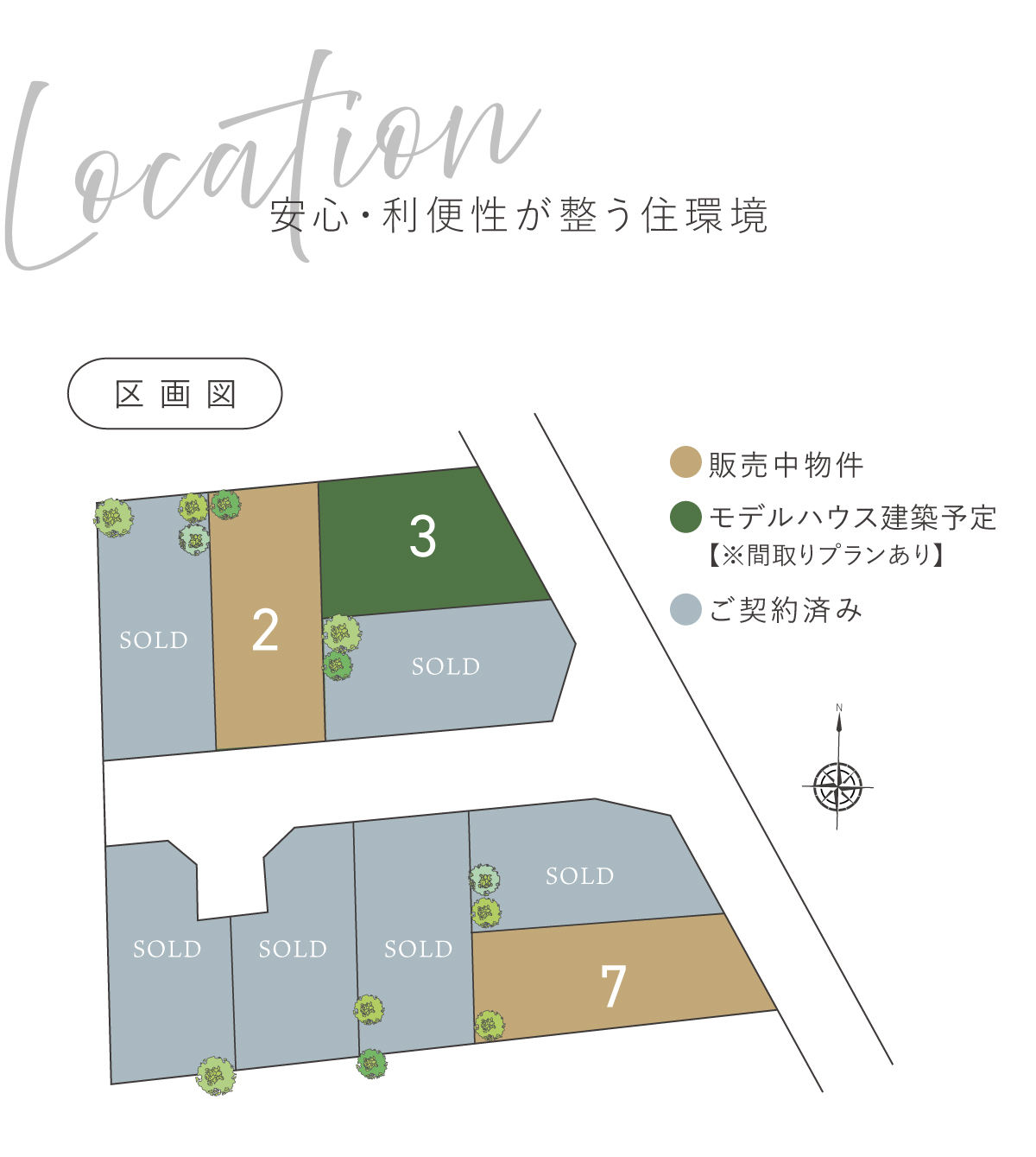 【概要】●所在地/姫路市東今宿6丁目●交通/JR姫新線「播磨高岡駅」徒歩12分、神姫バス「今宿」停徒歩9分●団地設備/電気(関西電力)、水道(公営)、排水(汚水・雑排水=公共下水、雨水=道路側溝へ放流)●総区画数/9区画●販売戸数/3戸(2・3・7号地)●販売価格/2号地3,990万円(税込)・敷地面積/150.59㎡・建物面積/121.10㎡、3号地(建築予定HK23-12585)3,390万円(税込)・敷地面積/135.89㎡・建物面積/109.60㎡、7号地3,650万円(税込)・敷地面積/151.57㎡・建物面積/107.17㎡●私道負担/なし●地目/宅地●用途地域/第一種中高層住居専用地域●建ぺい率/60%●容積率/200%●完成年月/2024年11月下旬(7号地)●手付金等の保証機関/株式会社広島銀行●取引態様/売主●構造/木造2階一戸建住宅(ガルバリウム葺/現場打ち鉄筋コンクリートベタ基礎/電化住宅)●建物設備/境界ブロック・フェンス(道路面除く)、Low-E複層ガラス、TVインターホン、洗面化粧台、ユニットバス(浴室換気乾燥暖房機付)、システムキッチン、3カ所給湯設備(台所、洗面、浴室)、フローリング床(廊下、洋室、リビング、ダイニング)、各居室コンセント、ACコンセント、TVコンセント、電話用空配管、LED照明器具(各居室、ポーチ灯、浴室、キッチン、洗面所、トイレ)防腐・防蟻工事他