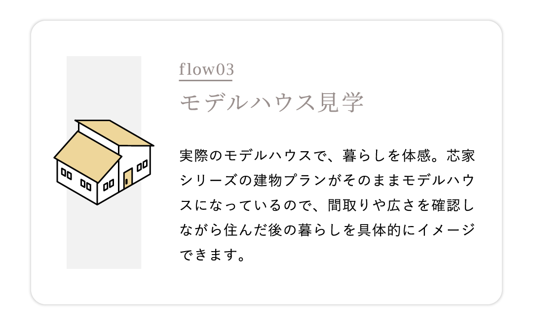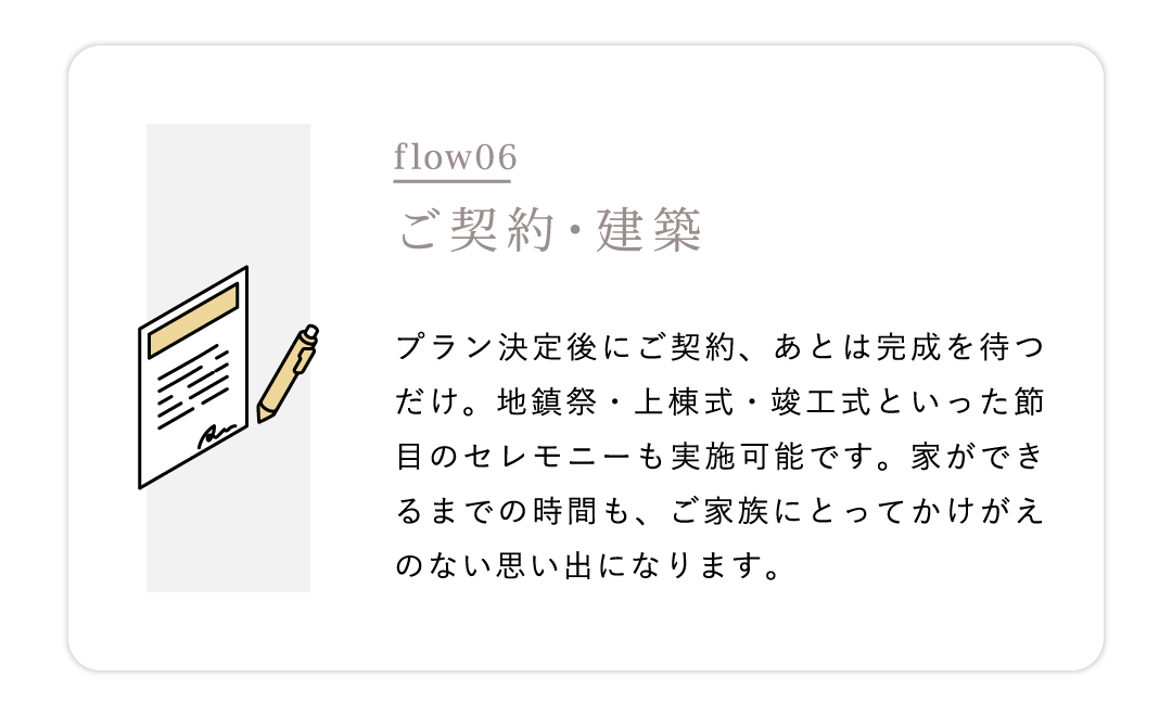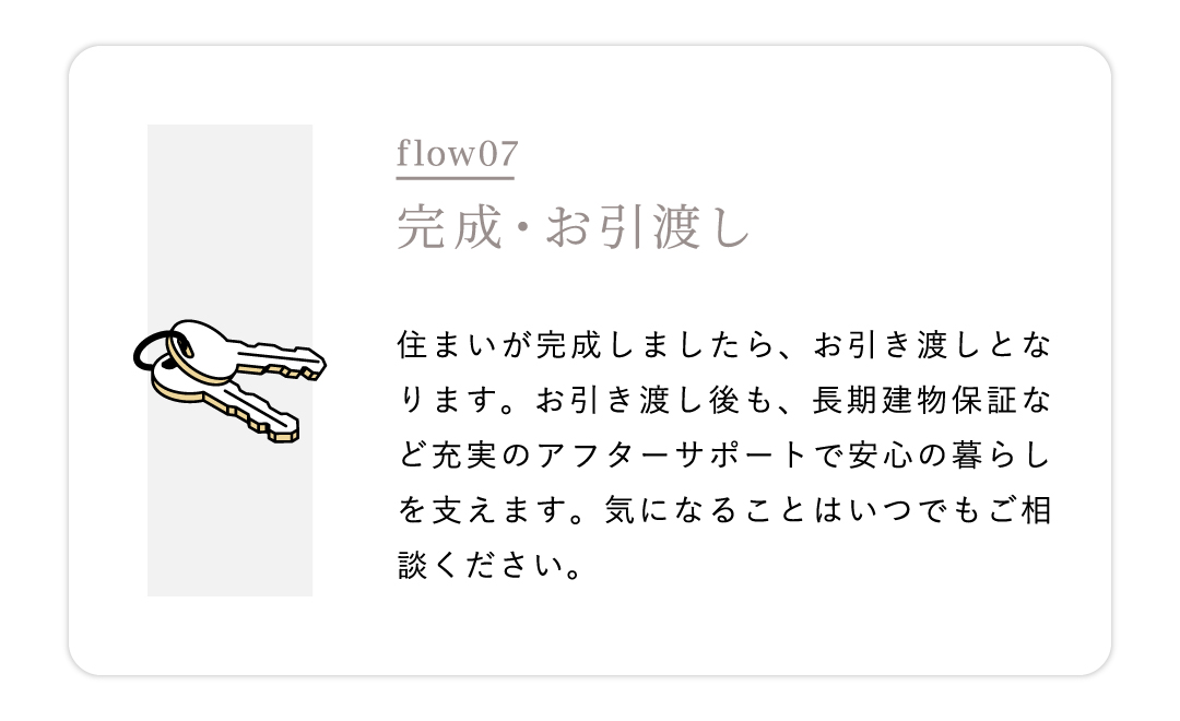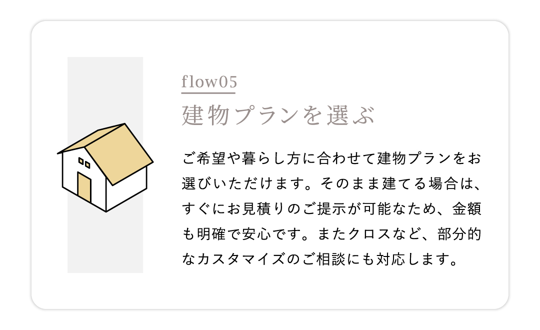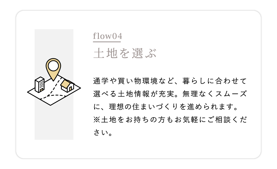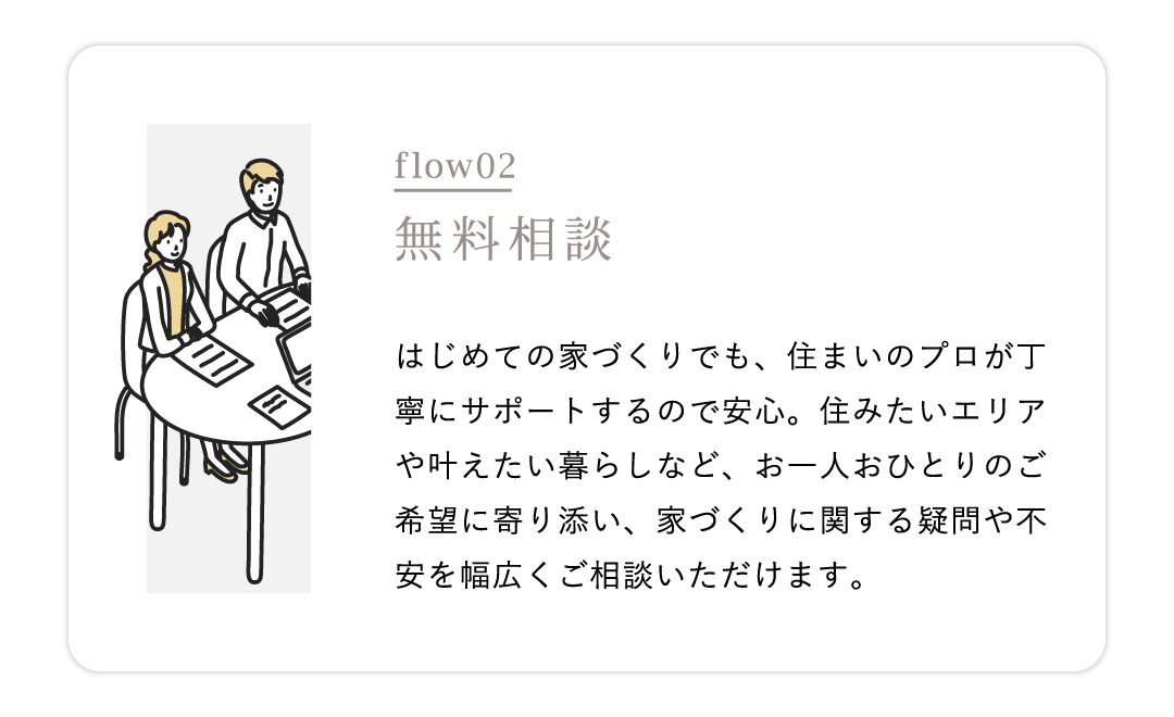 住宅ローンや進め方など、家づくりに関することを一つひとつ整理しながら進めていけます。