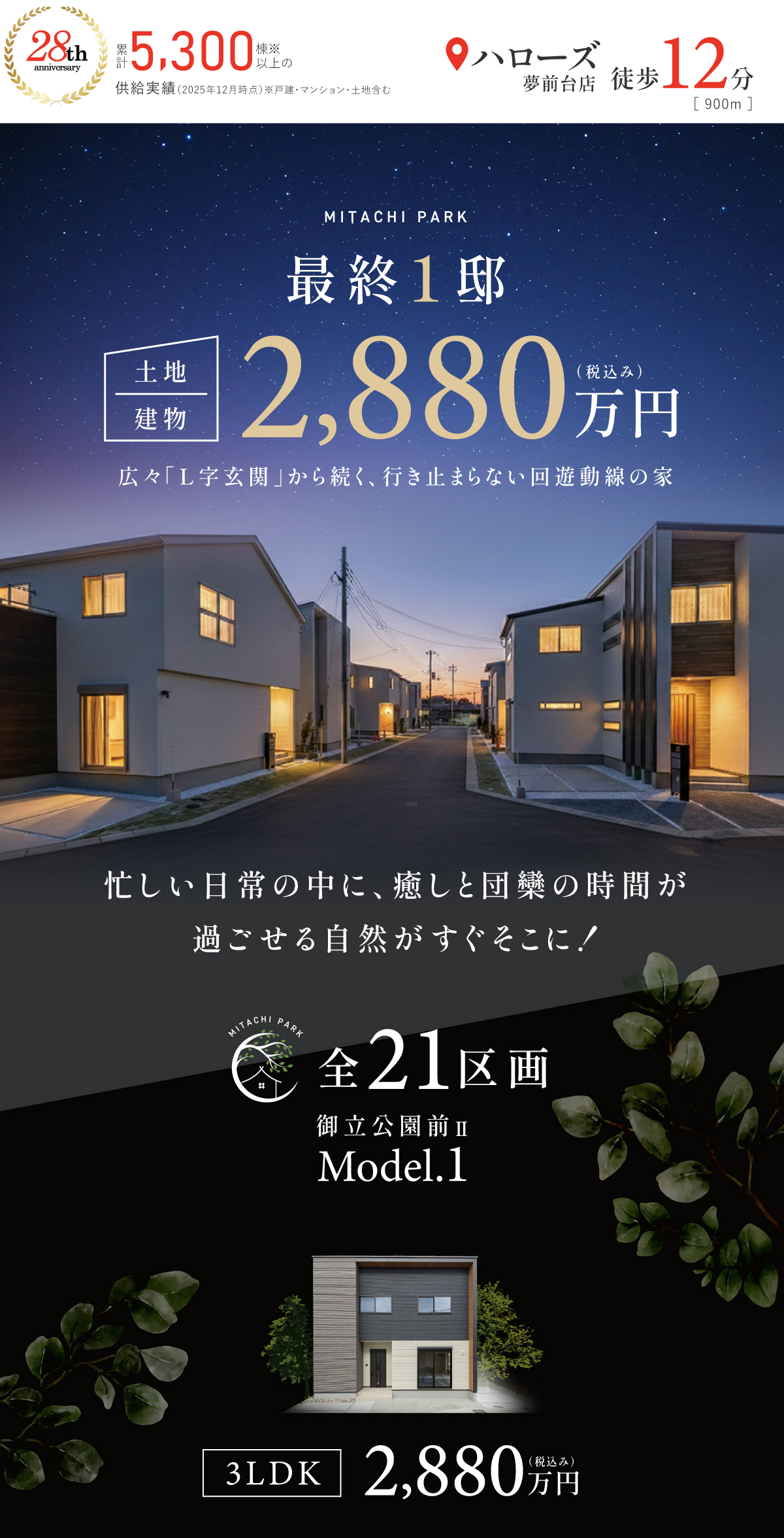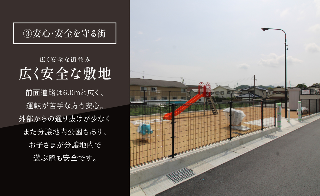 ●姫路市御立西6丁目●交通/JR姫新線「余部」駅徒歩37分、神姫バス「御立南口」停徒歩6分●団地設備/電気(関西電力)、水道(公営)、排水(汚水・雑排水=公共下水、雨水=道路側溝へ放流)、都市ガス●団地総面積・総区画数/22832.8㎡・21区画●私道負担/なし●地目/宅地●用途地域/第ニ種低層住居専用地域●建ぺい率/60% ●容積率/150% ●造成工事/完了済み ●手付金等の保証機関/株式会社広島銀行●取引態様/売主●分譲住宅販売戸数/3戸●構造/木造2階一戸建住宅(ガルバリウム葺※カラーベストの場合もあります/現場打ち鉄筋コンクリートベタ基礎/電化住宅)●建物設備/境界ブロック・フェンス(道路面除く)Low-E複層ガラス、TVインターホン、洗面化粧台、ユニットバス(浴室換気乾燥暖房機付)、システムキッチン、3カ所給湯設備(台所、洗面、浴室)、フローリング床(廊下、洋室、リビング、ダイニング)、各居室コンセント、ACコンセント、TVコンセント、電話用空配管、照明器具(各居室、ポーチ灯、浴室、キッチン、洗面所、トイレ)防腐・防蟻工事他●販売価格/Ⅱ-1号地2,880万円/3LDK/延床面積102.75㎡/土地面積124.30㎡(2025年9月完成済)