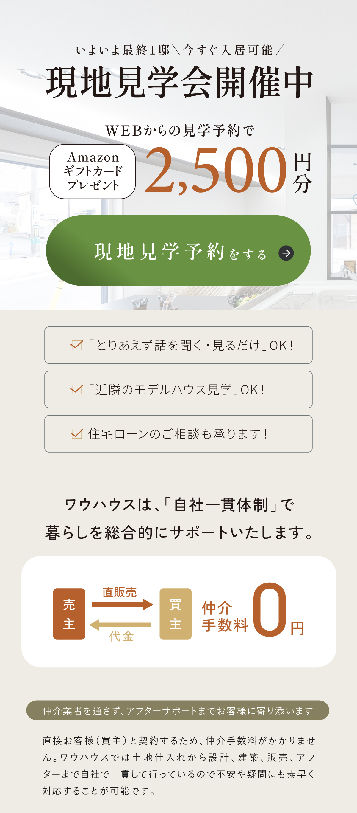はじめてワウハウスの店舗および物件にご来場される方で、ご来場アンケートにご協力いただける方のみ対象です。 ※同居のご家族1組につき、1回限りとさせていただきます。 ※複数物件へご来場いただいた場合でも、ご来場プレゼントは1回限りの進呈とさせていただきます。 ※お電話やポータルサイト等、公式サイトの予約フォーム以外からのご予約は対象外となります。 ※本特典はワウハウスによる提供です。本特典についてのお問い合わせはAmazonではお受けしておりません。 ※Amazon、Amazon.co.jpおよびそれらのロゴはAmazon.com, Inc. またはその関連会社の商標です。