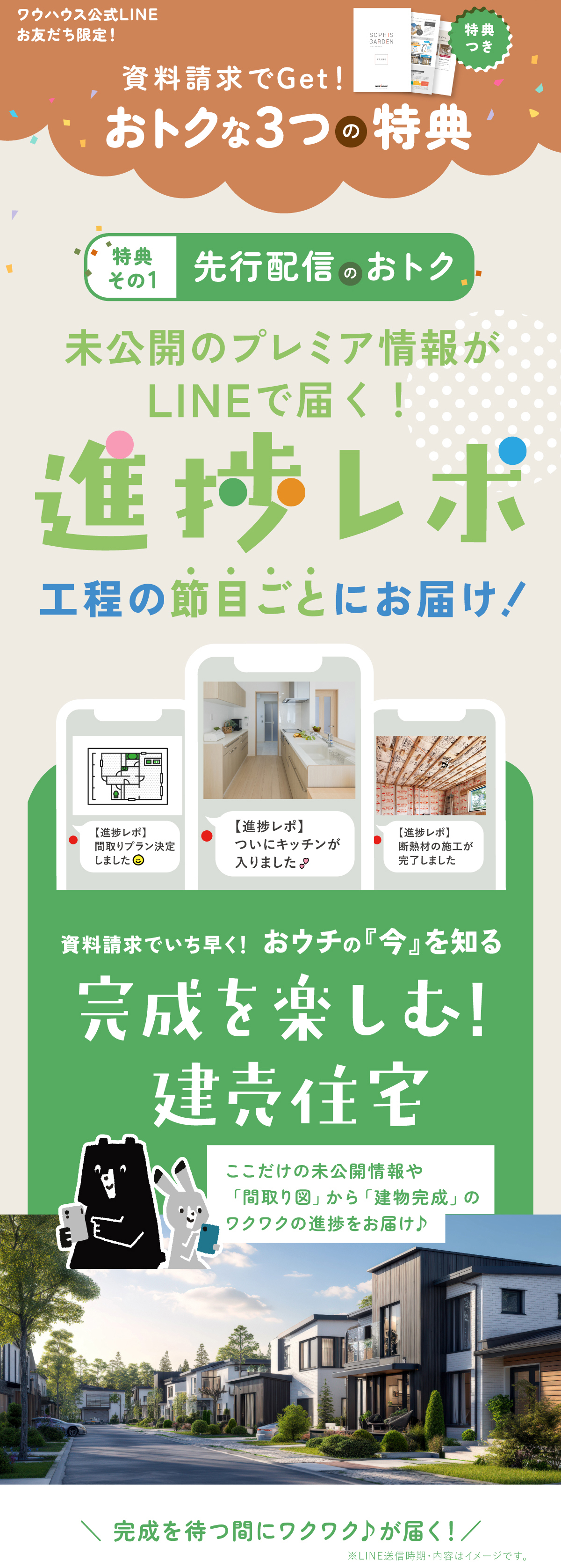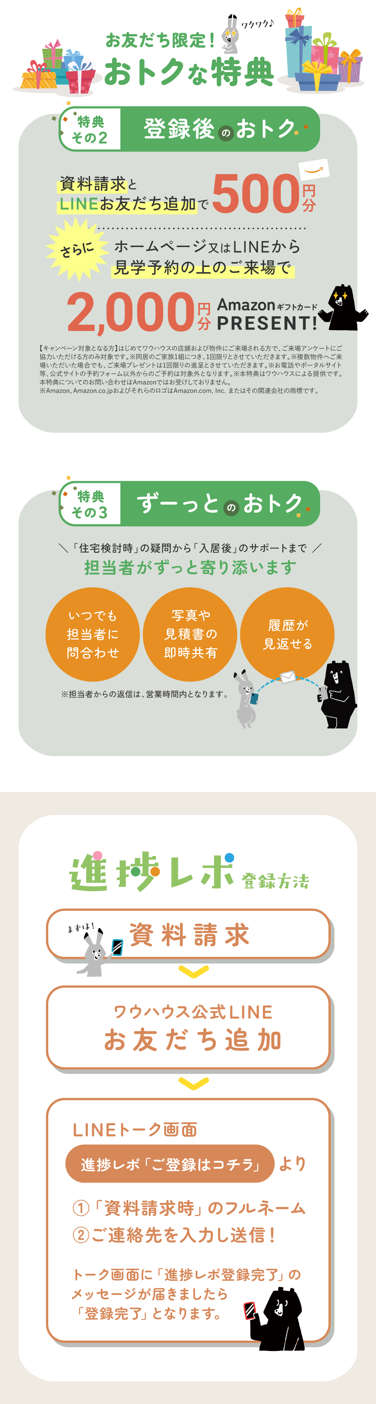 資料請求後に届く「LINE登録」についてのメールより、ワウハウス姫路公式LINEをお友達追加いただき、LINEトーク画面下の「進捗レポ登録はコチラ」からフルネーム・ご連絡先の入力でご登録いただけます。