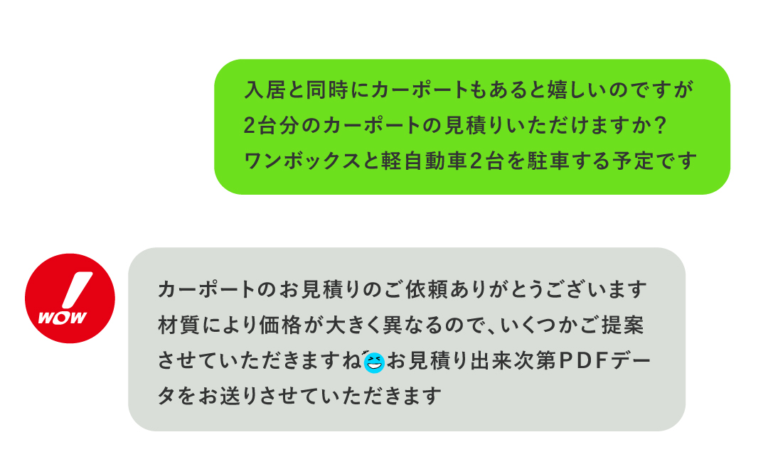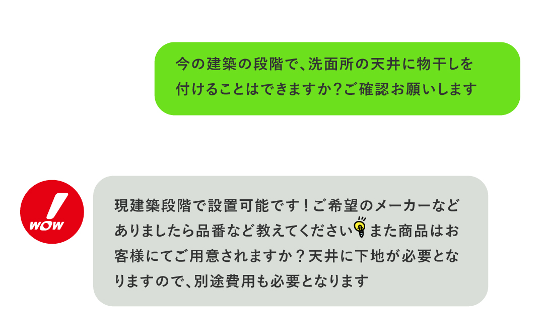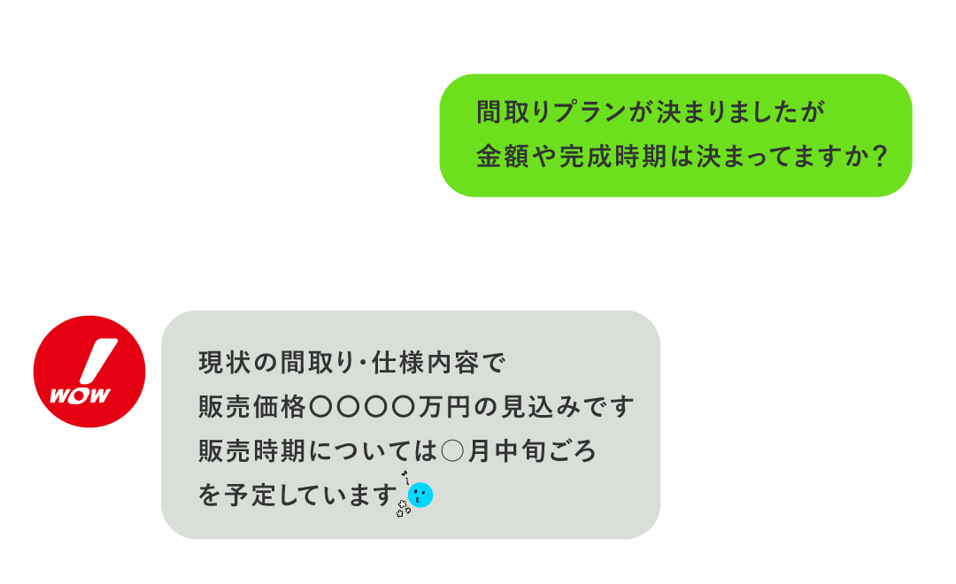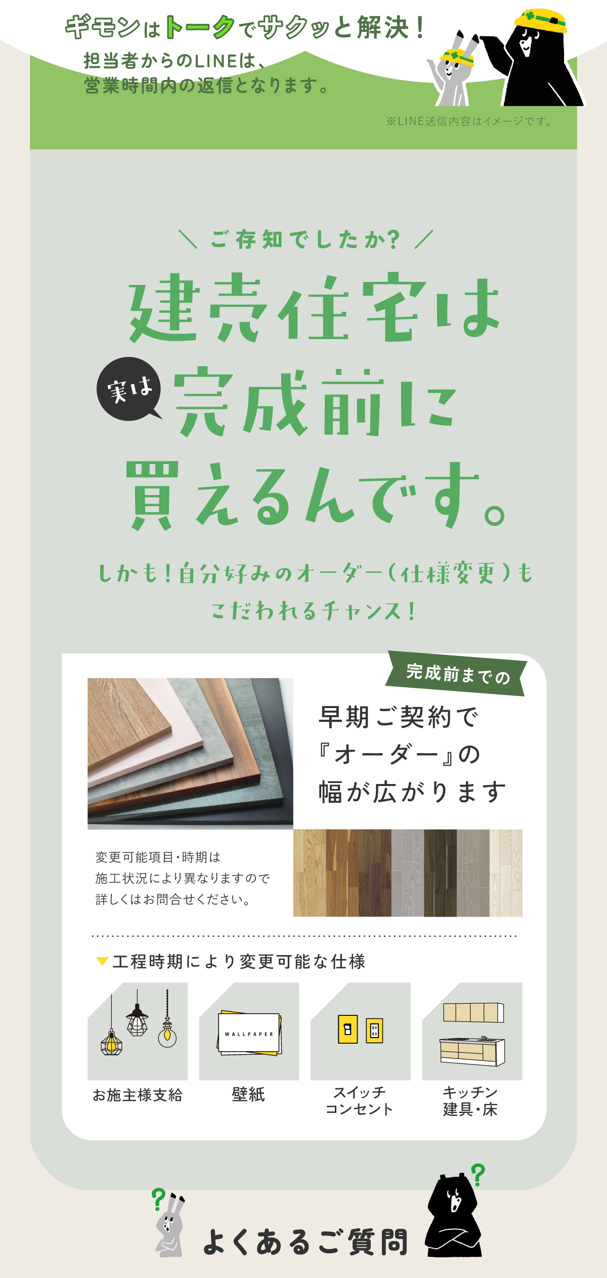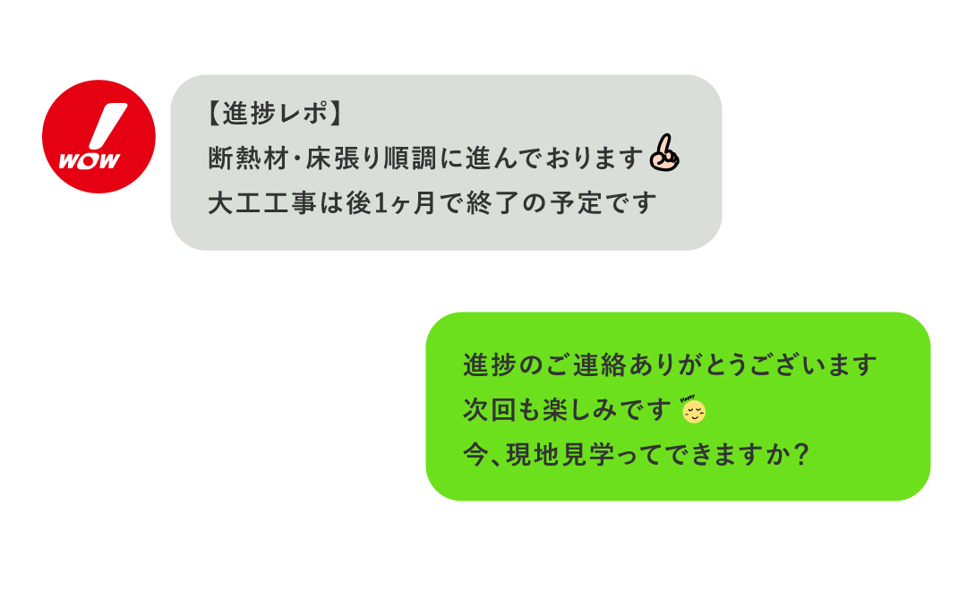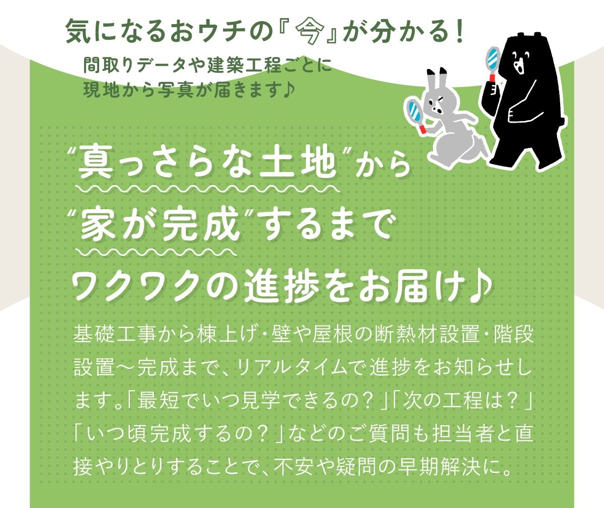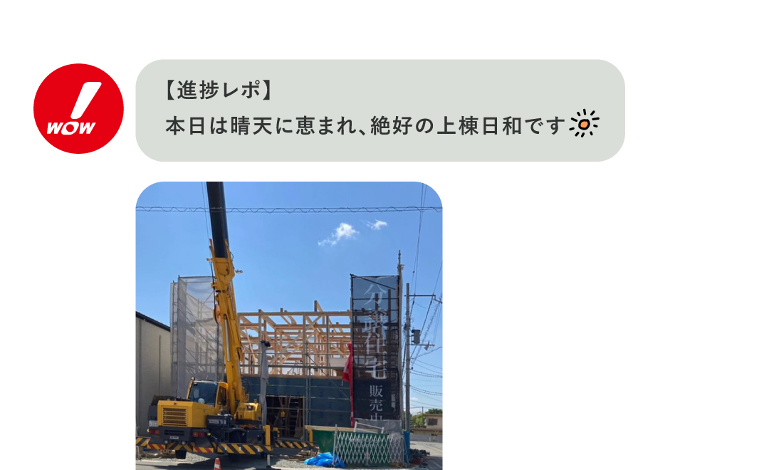 真っさらな更地から建物完成まで、ギモンやご相談はLINEでいつでもどうぞ!「いつ頃カタチが見えてくる?」や「今、中って見れる?」など思いついた時に送ってください。