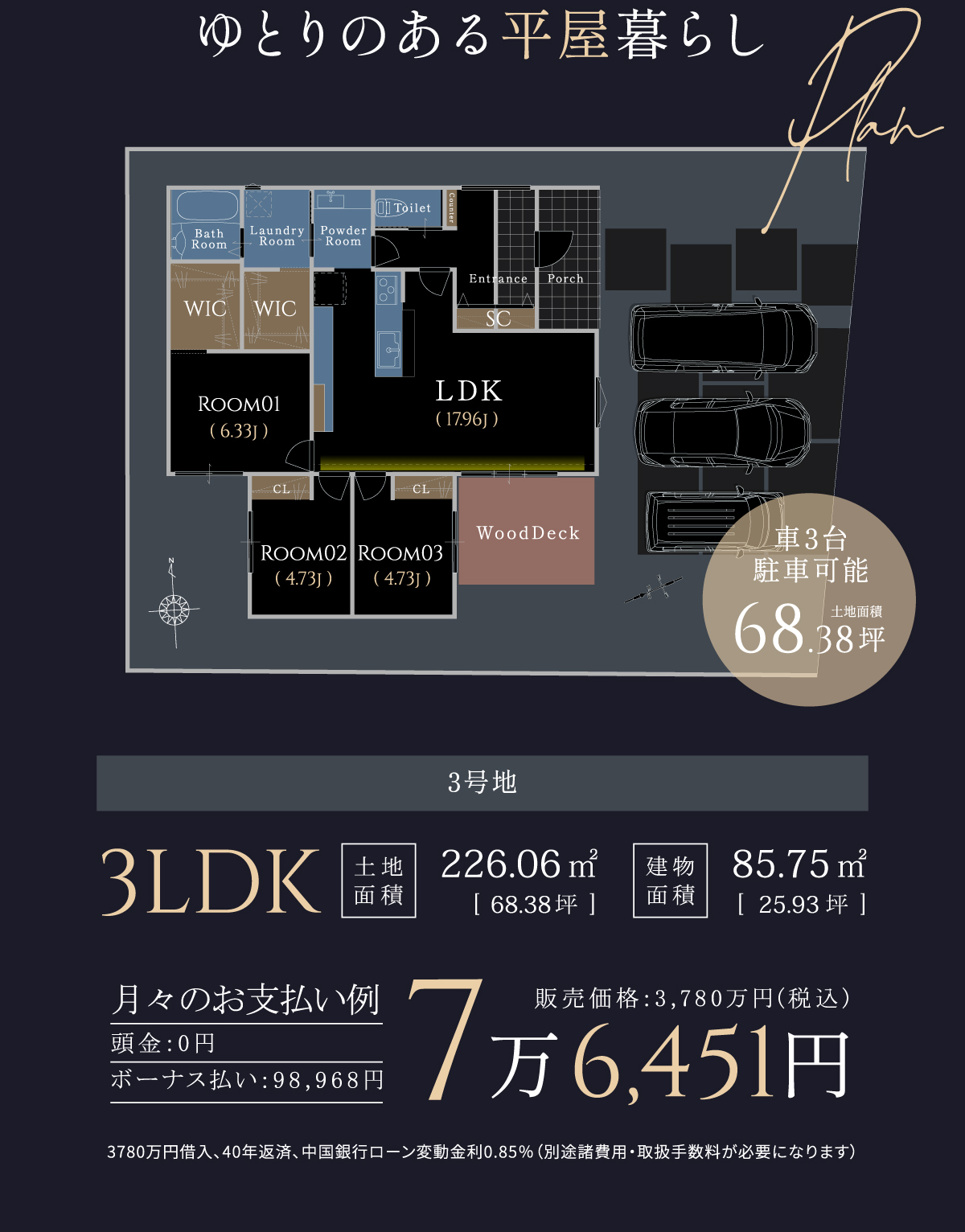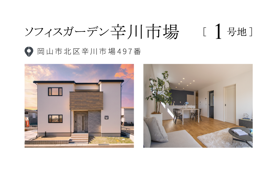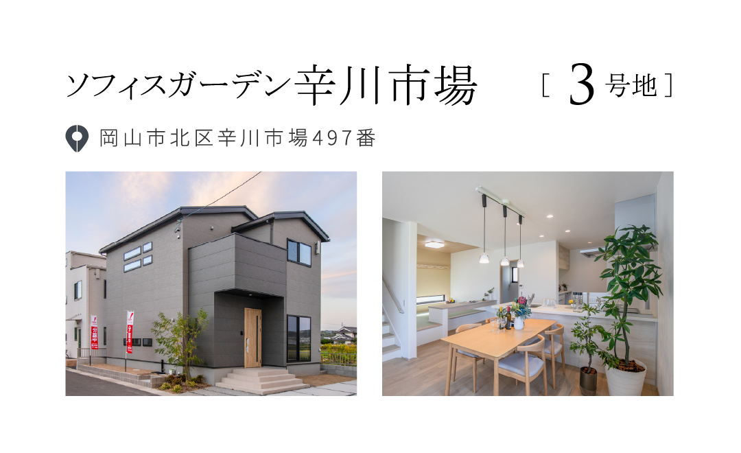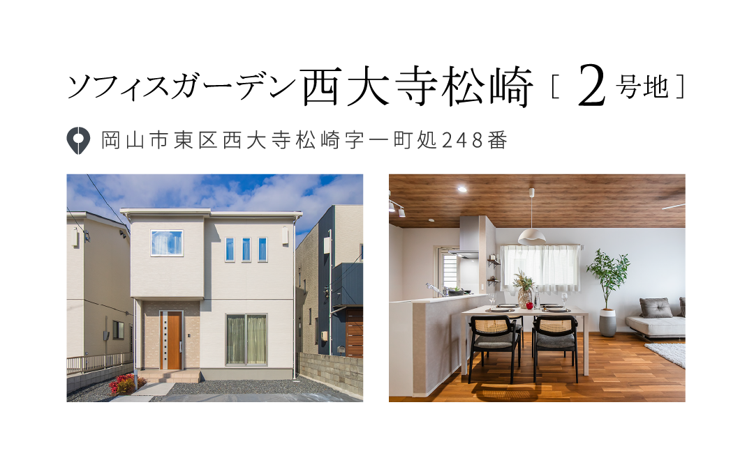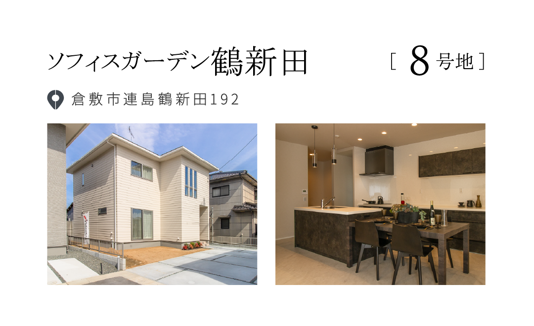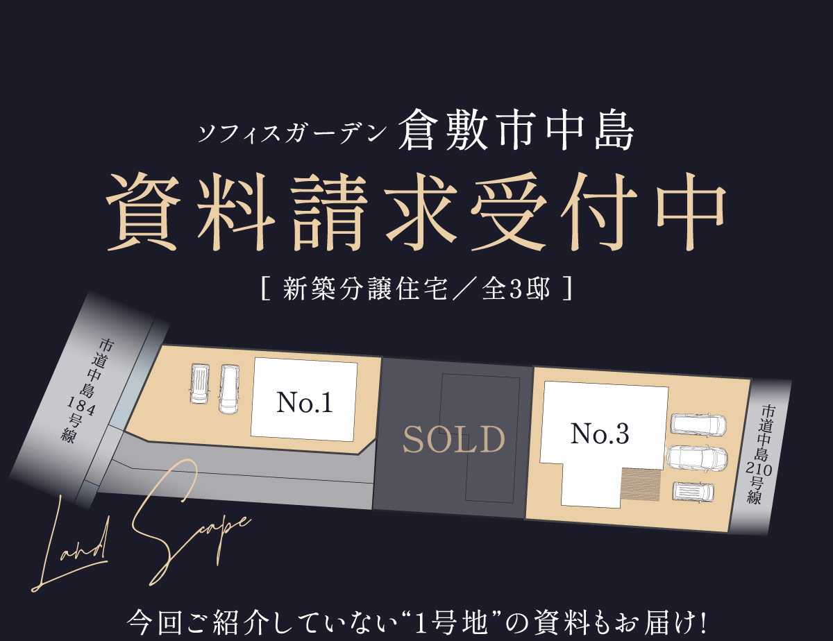 【物件概要】●所在地/岡山県倉敷市中島字小溝2070番1他●交通/水島臨海鉄道「福井」停徒歩11分(約850m)/両備バス「倉敷中央高校入口」駅徒歩4分(約280m)●総区画数/3区画●団地設備/都市ガス、中国電力、公営水道、公共下水●道路/西側幅員5.75m市道、東側幅員3.2m市道、団地内幅員4.5m私道●地目/宅地●都市計画/市街化区域●用途地域/第1種中高層住居専用地域●建ぺい率/60%●容積率/200%●取引態様/売主●BELS住宅●販売・設計・施工/ワウハウス株式会社